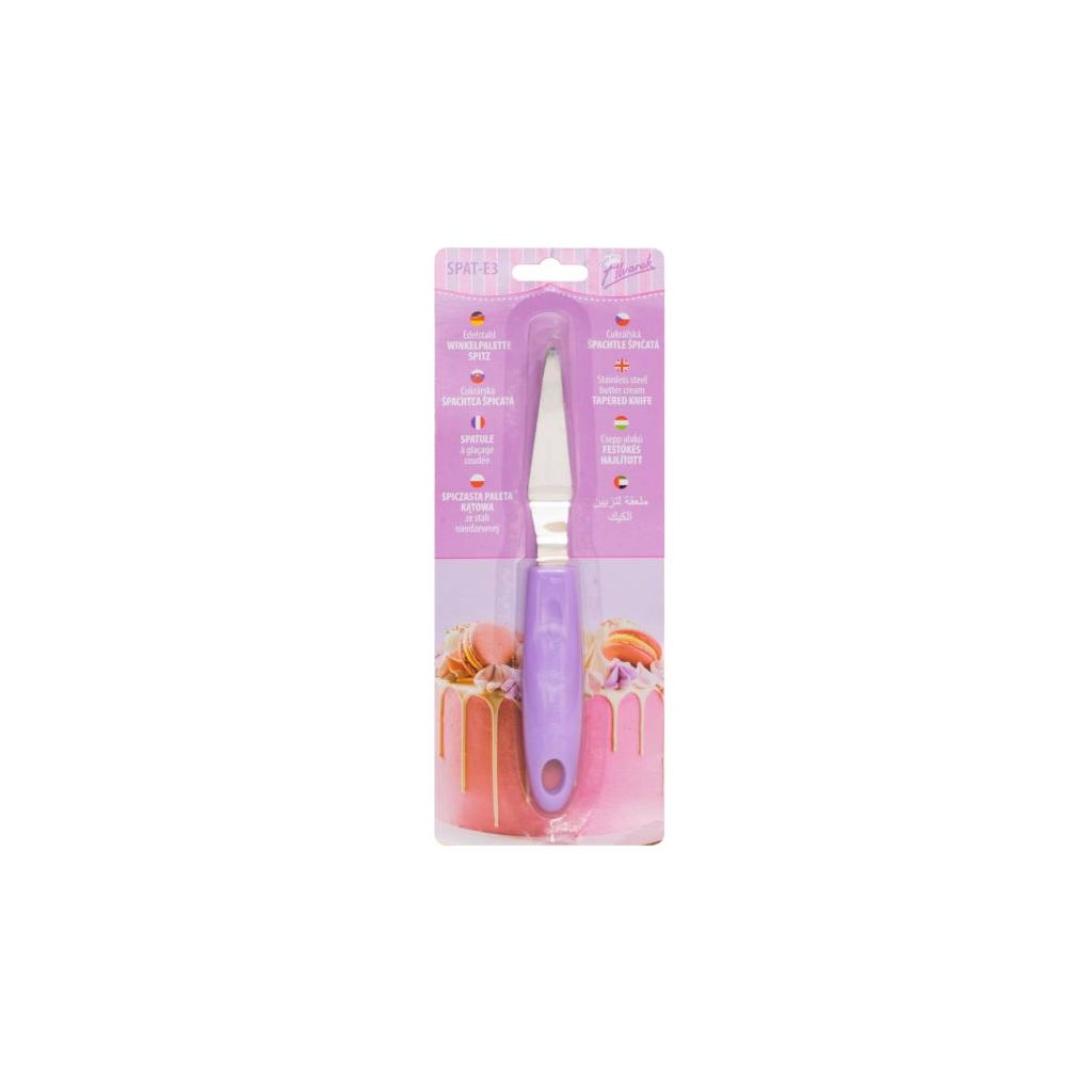 Nerezová cukrářská špachtle s ohybem vhodná na polevy je určená zejména na menší dorty a detaily. Materiál: nerezová ocel + plastová rukojeť Délka: 21 cm Délka čepele: 10 cm Šířka: 2 cmDoplňkové parametry