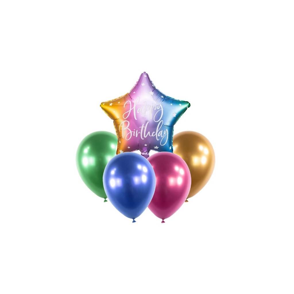 Sada se skládá z foliové hvězdy v duhové barvě s nápisem Happy Birthday o průměru 45 cm a 4 kusů chromových balonků v různých odstínech o průměru 30 cm. Balonky jsou vhodné na nafouknutí heliem i vzduchem. Buket se hodí na veselou oslavu narozenin pro dospělé i pro děti. Barva: mix barevObsah balení: 1 x duhová foliová hvězda, 4 x chromový latexový balonek: zelený, modrý, růžový, zlatýObjem celého buketu: cca 80 lObjem 1 ks balonku (latex): cca 16 lObjem 1 ks balonku (folie): cca 15 lNafukování: vzduch nebo héliumVýdrž hélia v foliovém balónku: 2 - 5 dníVýdrž hélia v latexovém balónku bez ošetření gelem: 16 hod.Výdrž hélia v latexovém balónku po ošetření gelem: cca 3 dnyMateriál: Latex, kovová folieObchodní balení: AnoBalení: 1 ksDoplňkové parametry