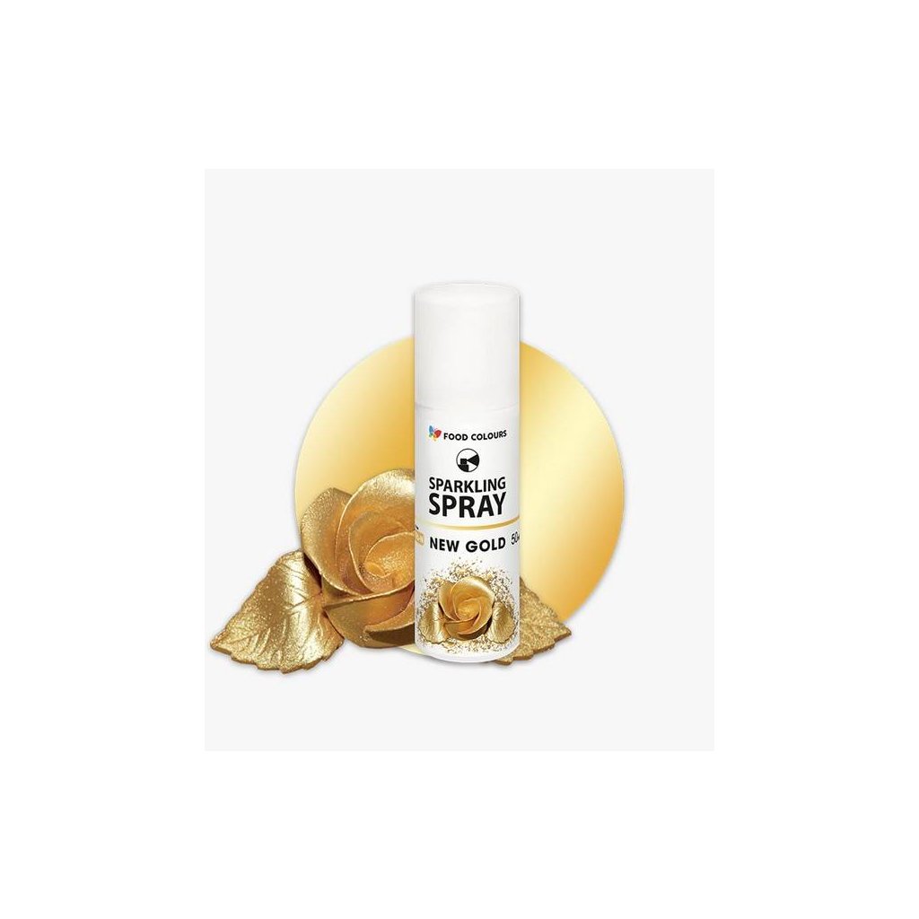Barva ve spreji je určena k rychlému tónování povrchů jak krémů, glazur, čokolády, polev tak i polotovarů z modelovacích hmot. Jednoduchým způsobem natónujete ozdoby či květiny do několika odstínů (podle intenzity a délky aplikace). Barvu protřepejte a ze vzdálenosti 15 - 20 cm aplikujte. Obsah 50 ml.Složení, co obsahuje produkt - Barva ve spreji Food Colours New Gold 50 ml Zlatá pro cukrářské účely: