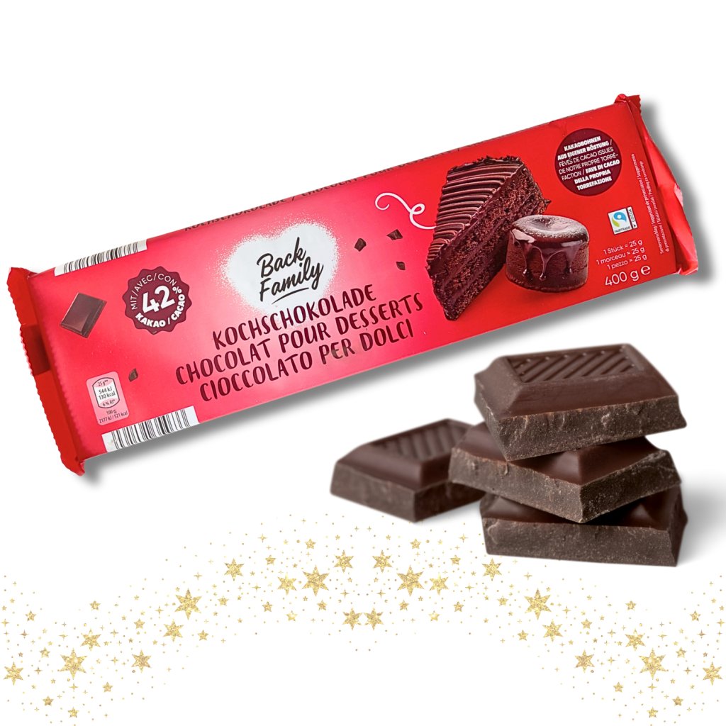 Obsah kakaa v čokoládě: nejméně 42%. 1 dílek = 25 g. U čokolády na vaření je důležité, aby se dobře rozpouštěla a v případě polevy zanechávala hladký povrch. K tomu je potřeba nejen vybrat kvalitní čokoládu, ale také použít správnou teplotu a postup při jejím rozpouštění. Tajemství krásně lesklého povrchu čokoládové polevy se jmenuje temperování. Čokoládu na vaření je nutné před samotným poléváním temperovat. Temperovaná čokoláda pak tuhne rychleji než čokoláda příliš horká. Důvodem je, že temperováním čokolády se stabilizuje obsažené kakaové máslo, které pak krystalizuje hezky rovnoměrně. Jak temperovat tuto rakouskou čokoládu: Čokoládu nejprve pomalu rozpusťte při teplotě 45 - 50°C za stálého míchání. Tím se rozpustí všechny složky tuku obsažené v kakaovém másle. Pak čokoládu ochlaďte na 28°C přidáním drobných kousků čokolády do již roztavené hmoty (tzv. očkováním) nebo ještě lépe mícháním ve vodní lázni. Tím se vytvoří pevná mikrokrystalická mřížka, která dá čokoládě právě její pevnost a lesk. Opětovným zahřátím na 30 - 32°C upevníte chlazením vytvořenou novou strukturu čokolády a můžeme ji rovnou použít na polevu.