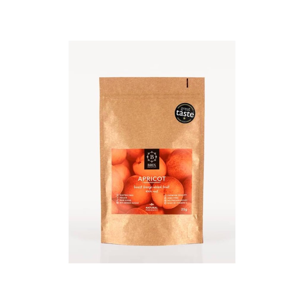 Ovoce sušené mrazem je 100% čisté ovoce, ze kterého je odstraněna voda. Je křupavě vysušeno, zachovává si barvu, chuť a až 98% výživových hodnot, takže je téměř identické s původním ovocem. Je bez konzervantů. Může být rehydrováno nebo konzumováno přímo. Ideální do müsli, jogurtů, sorbetů, smoothies, pro kulinářské speciality a pečení. Vyrobené z 250 g čerstvého ovovce. Složení: 100% meruňky dehydrované procesem lyofilizace (proces sušení mrazem) Nutriční hodnoty ve 100 g: energie 1608 kJ/383 kcal, tuky 0,64 g (z toho nasycené 0,19 g), sacharidy 87,3 g (z toho cukry 59,8 g), vláknina 5,9 g, bílkoviny 5,97 g, sůl <0,01 gDoplňkové parametry