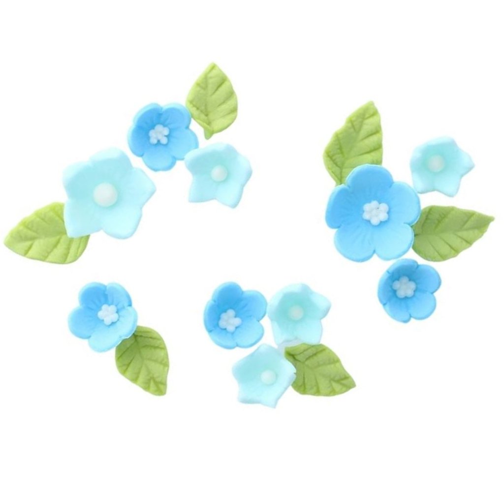 Oslavte každou zvláštní příležitost s těmito krásnými modrými cukrovými květy a listy. Perfektní pro zdobení cupcaků nebo, v kombinaci do vzoru, dortu plné velikosti.