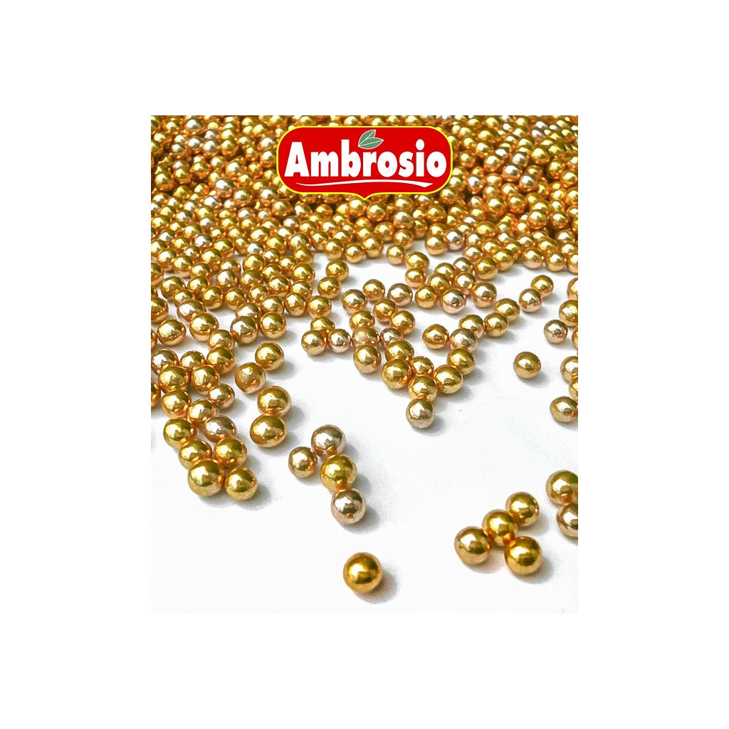 Cukrové kuličky potahované zlatou barvou se používají v cukrářské výrobě na zdobení dortů,
