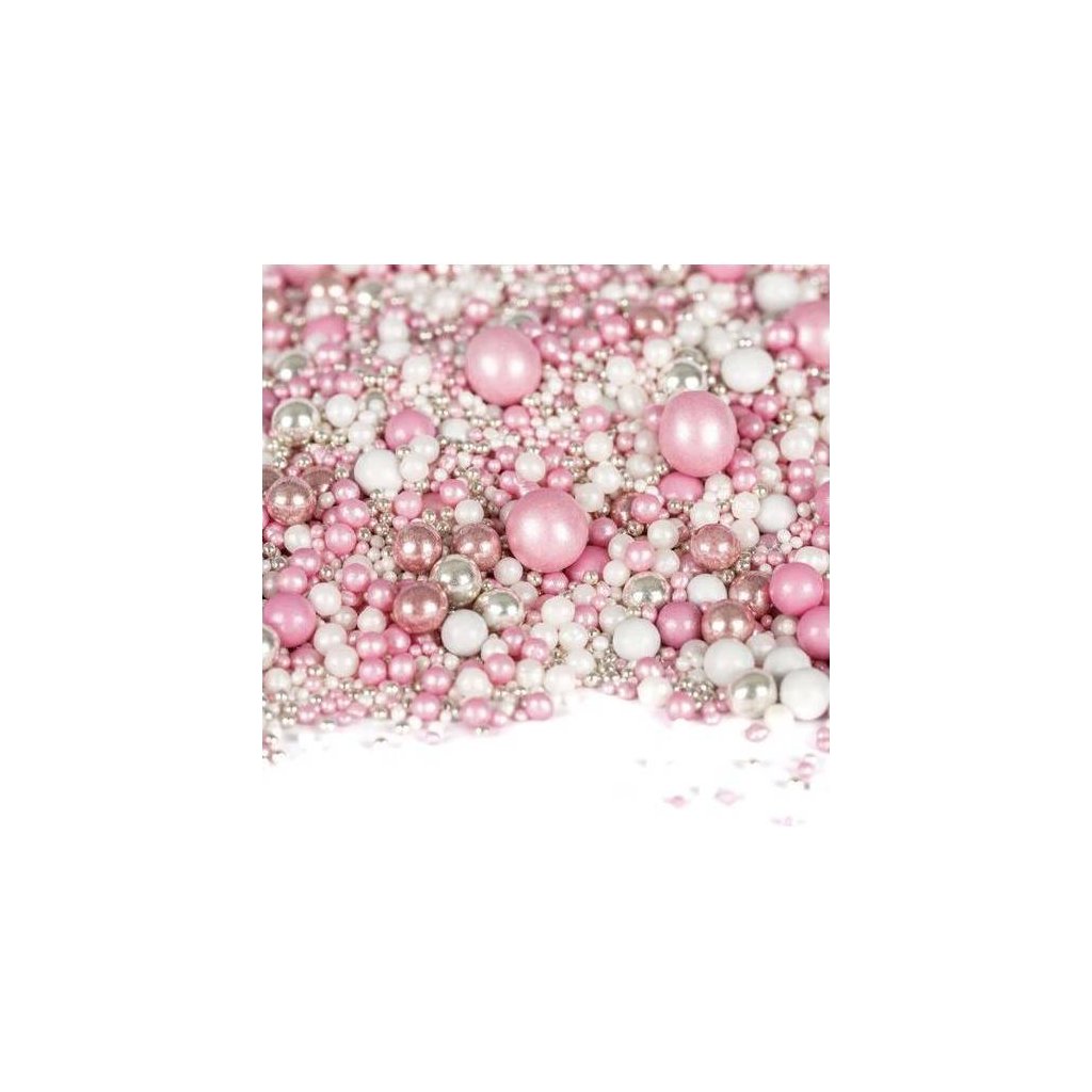 Cukrové a čokoládové perličky růžový mix. Balení 90 g.Doplňkové parametry