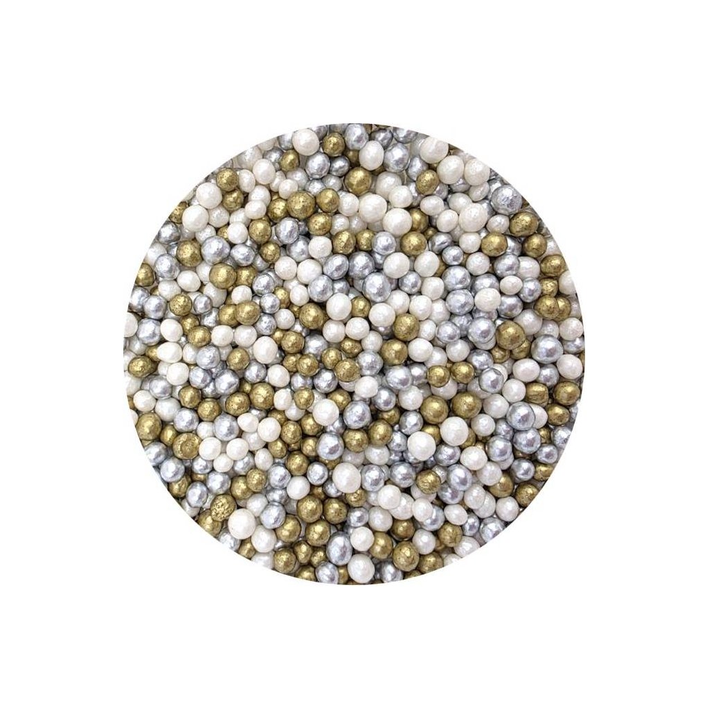 Cukrovo-rýžové perly mix stříbrno-bílo-zlaté 5mm 80g - I LOVE CAKES | Skvělé pro Váš domácí dort