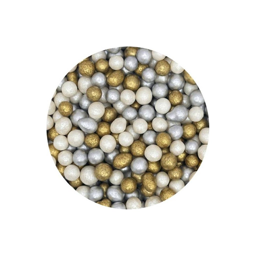 Cukrovo-rýžové perly stříbrno-bílo-zlaté, velké 5 mm. Balení 1 kg.Doplňkové parametry