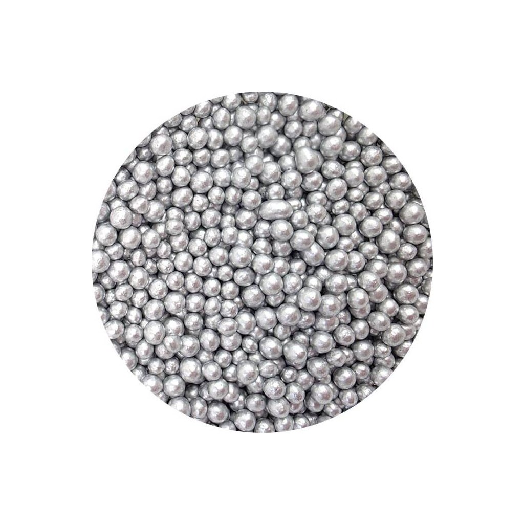 Cukrovo-rýžové perly stříbrné, velké 5 mm. Balení 80 g.Doplňkové parametry