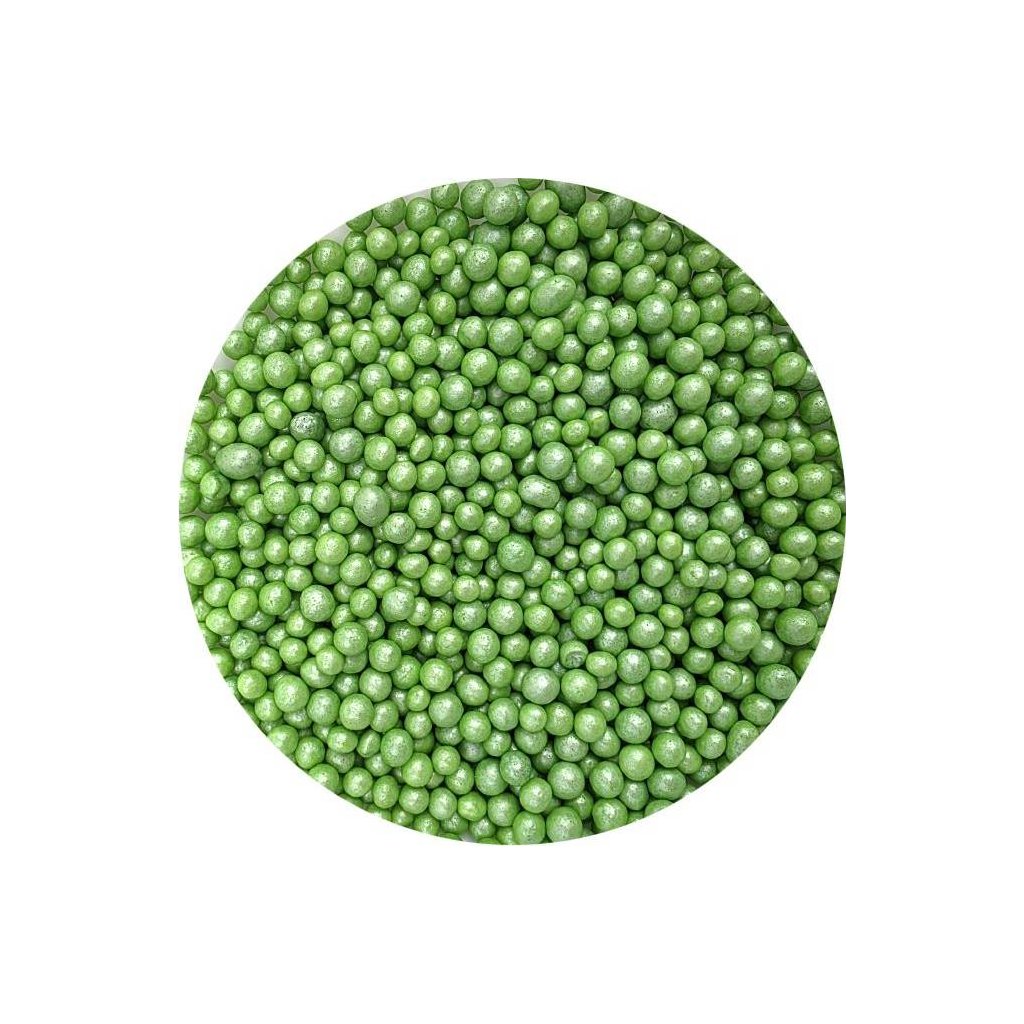 Cukrovo-rýžové perly zelené perleťové, velké 5 mm. Balení 80 g.Doplňkové parametry