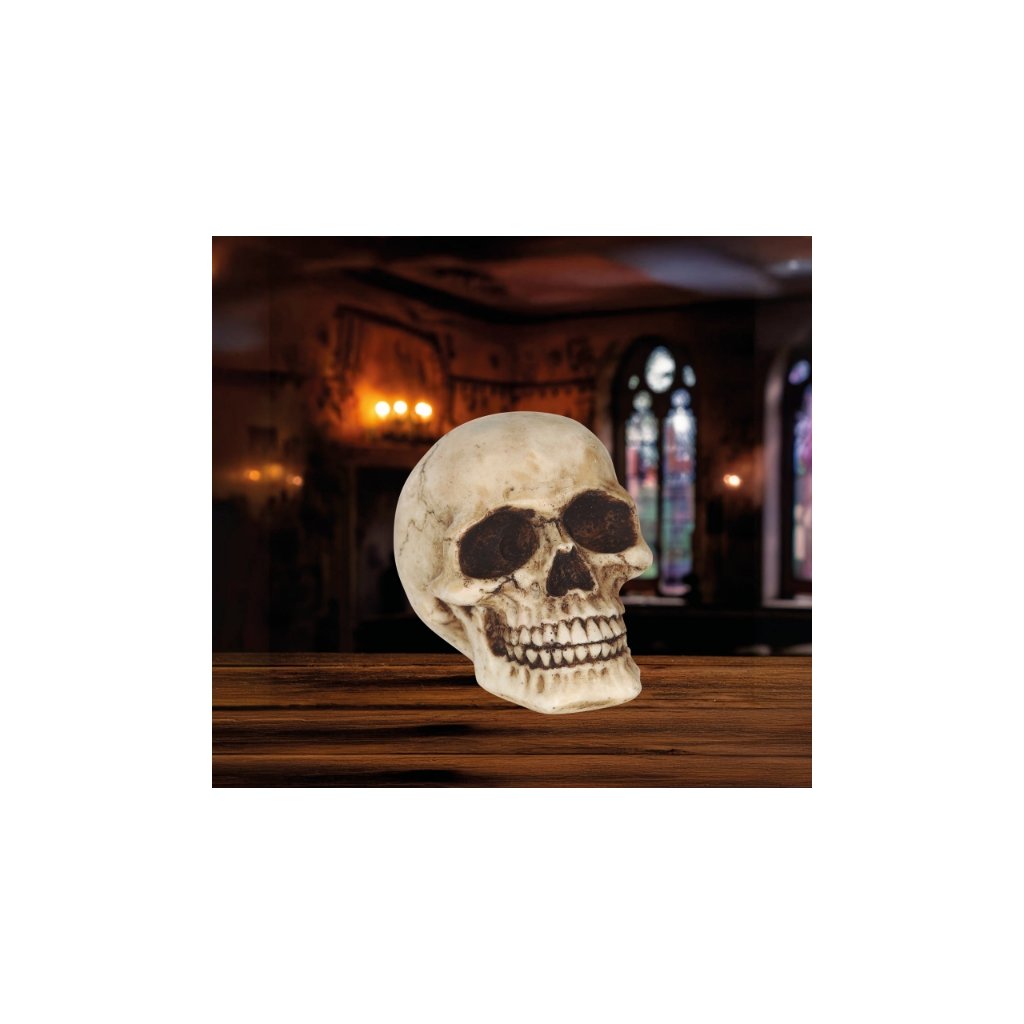 Dekorace lebka z resinového materiálu vypadá díky detailnímu zpracování velmi realisticky a dokáže navodit tajemnou až strašidelnou atmosféru. Hodí se jako doplněk na Halloween, hororovou oslavu, tematické večírky i jako originální rekvizita do fotokoutku.Lebka je pevná, stabilní a díky menší velikosti ji lze snadno umístit na stůl, polici nebo jako součást větší dekorace. Technické parametry:Rozměry: 9 x 7 x 6 cmMateriál: resinBarva: béžová s patinouBalení: 1 ksDoplňkové parametry