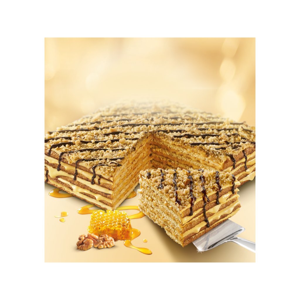 ZAHUŠTĚNÉ MLÉKO slazené s kakaem 33,3% (MLÉKO, cukr, glukózový sirup, kakaový prášek), margarín 19% [palmový tuk, plně ztužený kokosový tuk, řepkový olej, voda, jedlá sůl, emulgátor (mono- a diglyceridy mastných kyselin, slunečnicový lecitin), regulátor kyselosti (kyselina citrónová), aroma, barvivo (beta-karoten), vitaminy (A,D)], PŠENIČNÁ MOUKA 15,2%, cukr 14,3%, VAJEČNÁ MELANŽ11%, med 4,4%, OŘECHY VLAŠSKÉ 1,2%, kypřící látka (hydrogenuhličitan sodný) 0,6%, přírodní vanilkové aroma