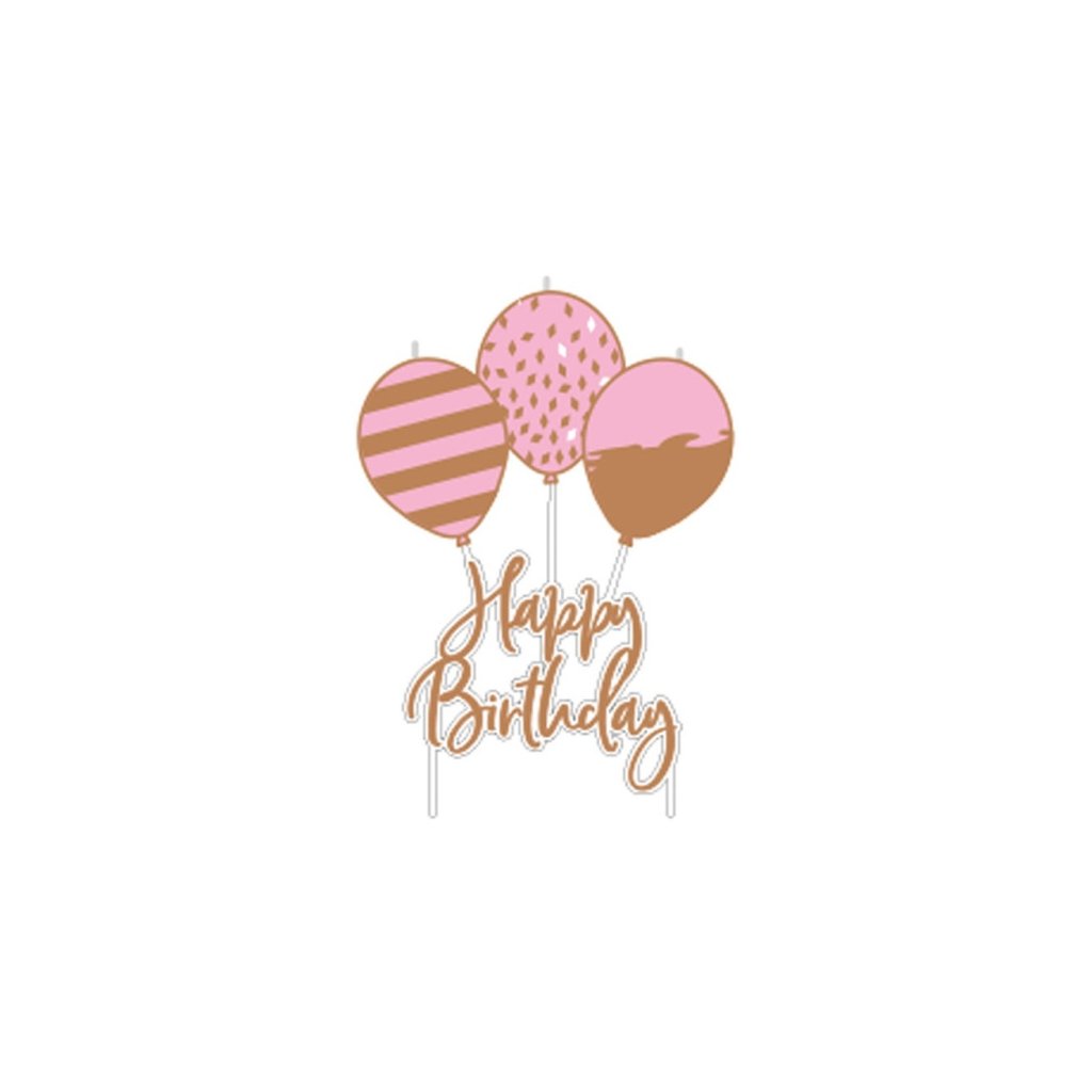 Svíčka s balonky a nápisem Happy Birthday v rosegold barvě vhodná k ozdobení jakéhokoliv dortu nebo muffinu. Rozměr: 6,2 x 11,3 cm. Balení: 1 ks.Doplňkové parametry