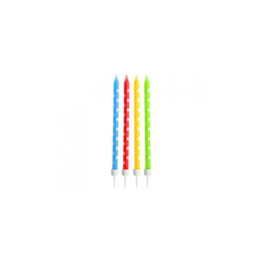 Dortové svíčky dlouhé v krásných barvách opatřené puntíky. Udělají radost každému oslavenci, nejen dětem. Rozměr: 11 cm. Balení: 24 ks.Doplňkové parametry