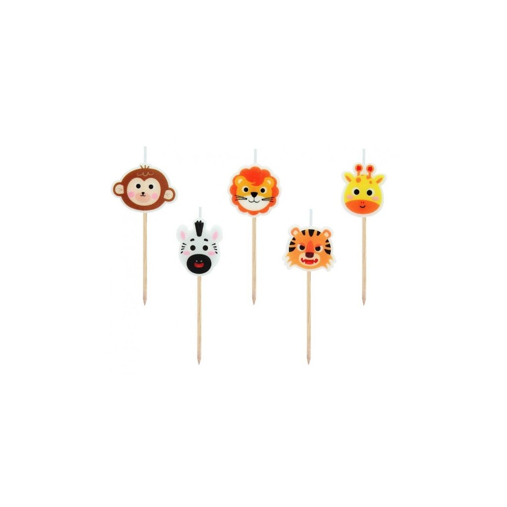 Vzor: tygr, žirafa, zebra, opice, lev Výška svíčky: 3 cm Celková výška (s tyčí): 7 cm Počet kusů v balení: 5Doplňkové parametry