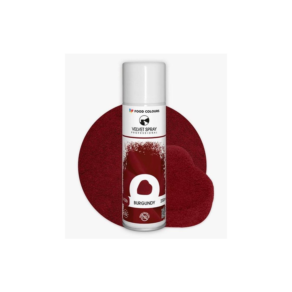 Sametová barva ve spreji ke zdobení vychlazených povrchů, např. máslových krémů, fondánových hmot, marcipánu, zákusků, čokolády a dalších. Složení: hnací plyn: E943a, E944, E943b, kakaový tuk, barviva E170, E120, E172, emulgátor E322 sójový lecicitn, antioxidant E392Doplňkové parametry