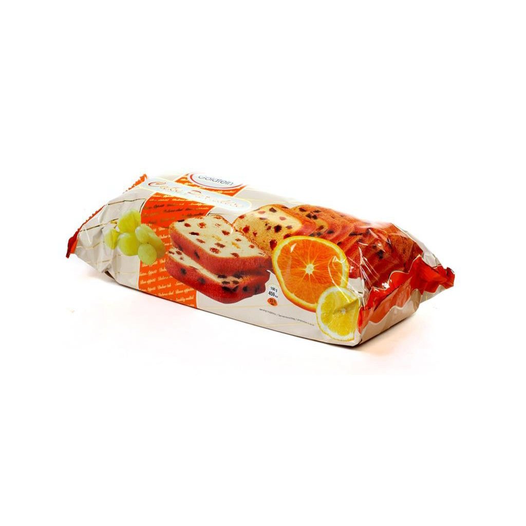 - cukr, PŠENIČNÁ mouka, řepkový olej, VEJCE, rozinky 9 %, zvlhčující látky: sorbitol, glycerol; proslazená pomerančová kůra 2 % (pomerančová kůra 57 %, glukózo-fruktózový sirup, cukr, regulátor kyselosti: kyselina citronová), glukózový sirup, PŠENIČNÝ škrob, kypřící látky: difosforečnany, uhličitany sodné, regulátor kyselosti: octany sodné, emulgátor: mono a diglyceridy mastných kyselin, kukuřičný škrob, zahušťovadlo: xantan, jedlá sůl, aroma, SÓJOVÁ mouka.