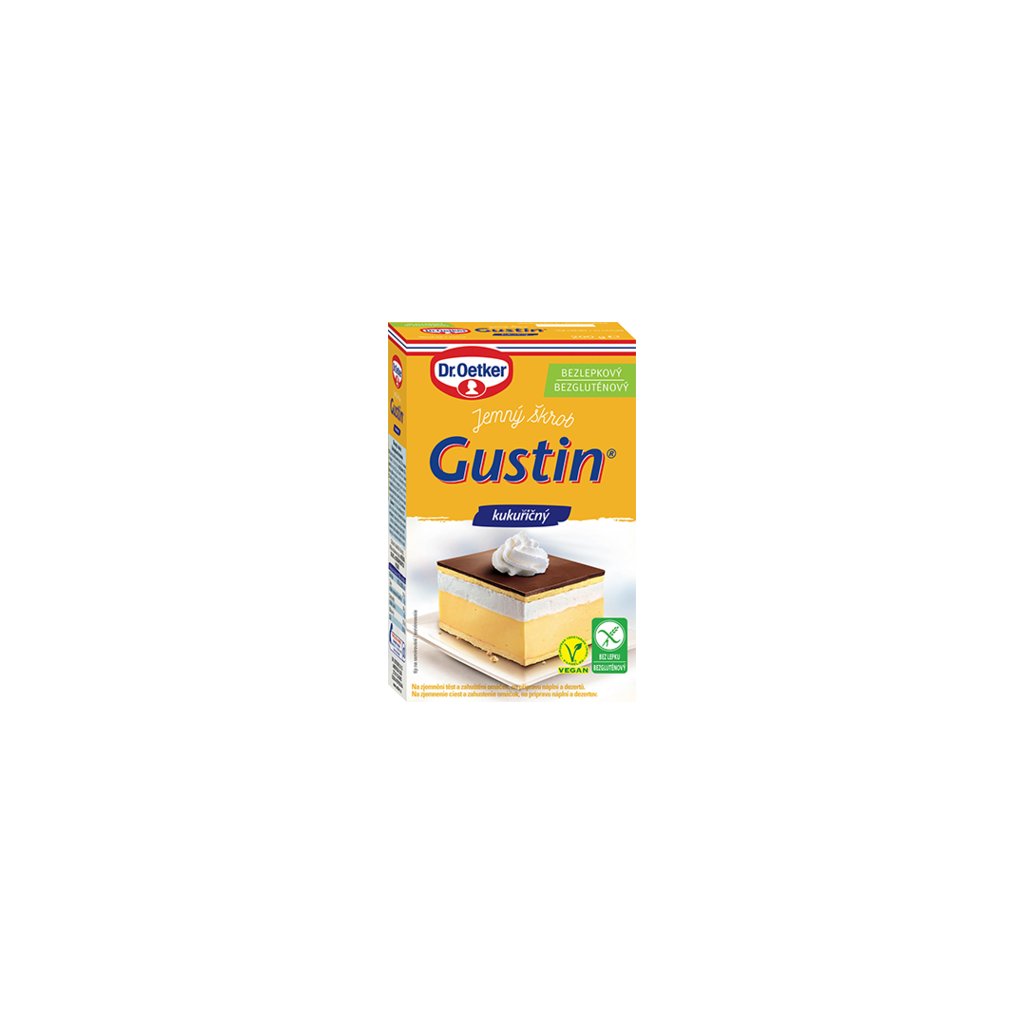 - Piškotovému těstu dodává jemnou strukturu. Lze použít na přípravu různých dezertů, náplní a omáček za tepla.Recept z obalu: Kremeše:500g listového těsta, 250ml smetany ke šlehání, 1l mléka, 4 žloutky, 80g Gustinu, 250g změklého másla, 150g moučkového cukru. Listové těsto rozdělíme na poloviny a z každé vyválíme plát (30x40cm).Vložíme na vymazaný plech a pečeme v předehřáté troubě při 250°C (10minut). V míse vyšleháme elektrickým šlehačem smetanu na nejvyšším stupni do tuha. Žloutky smícháme s Gustinem v 1/4 l mléka, vmícháme do 3/4 l vařícího mléka a vaříme do zhoustnutí. Necháme vychladnout. V míse vyšleháme máslo s cukrem dohladka a přidáme žloutkový krém. Náplň naneseme na plát a uhladíme. Opatrně přiložíme druhý plát a necháme do druhého dne uležet.