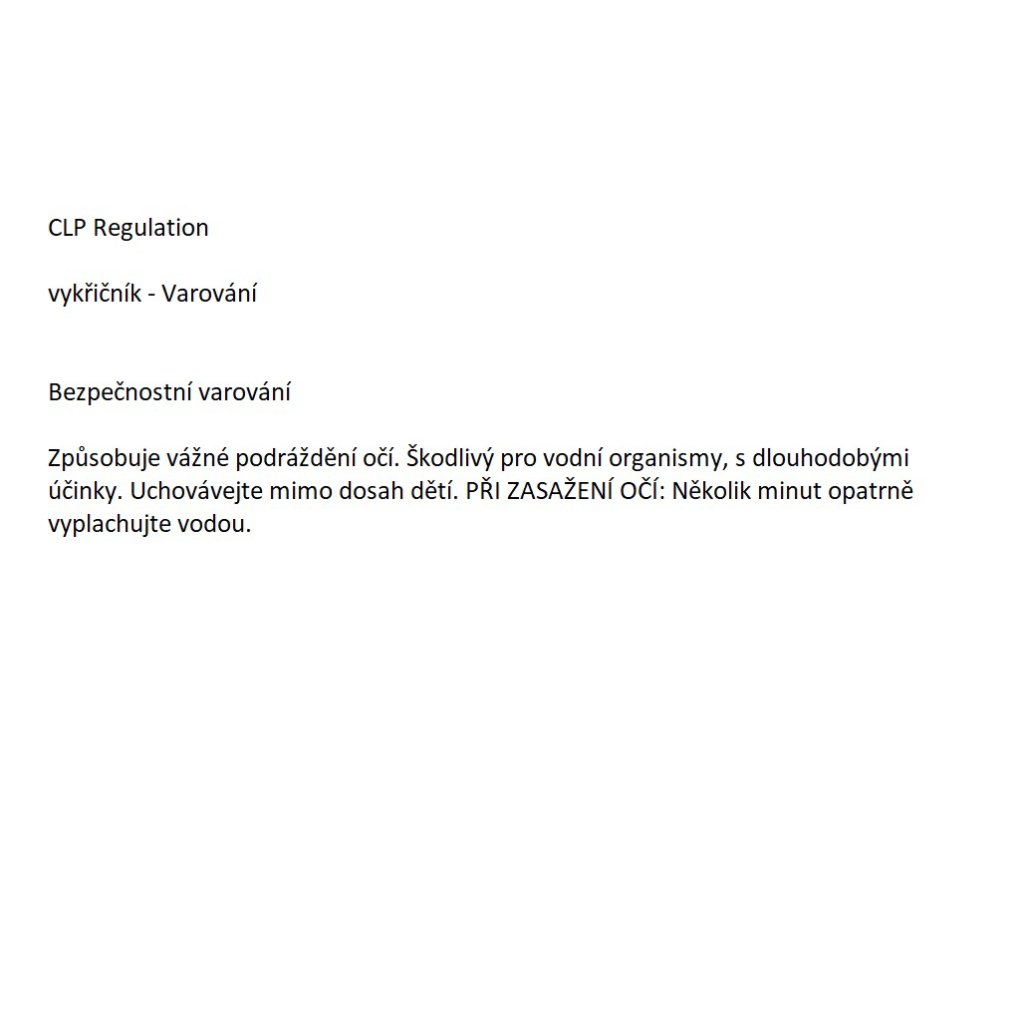 Upozornění o nebezpečnosti: | Varování: Způsobuje vážné podráždění očí. Uchovávejte mimo dosah dětí. PŘI ZASAŽENÍ OČÍ: Několik minut opatrně vyplachujte vodou. Vyjměte kontaktní čočky, jsou-li nasazeny. Pokračujte ve vyplachování. Je-li nutná lékařská pomoc, mějte po ruce obal nebo štítek výrobku. Přetrvává-li podráždění očí: Vyhledejte lékařskou pomoc/ošetření. |