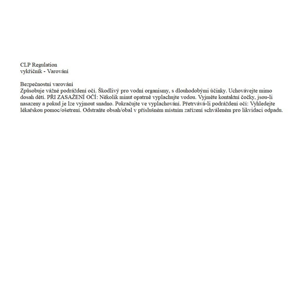 Upozornění o nebezpečnosti: | Varování: Způsobuje vážné podráždění očí. Uchovávejte mimo dosah dětí. PŘI ZASAŽENÍ OČÍ: Několik minut opatrně vyplachujte vodou. Vyjměte kontaktní čočky, jsou-li nasazeny. Pokračujte ve vyplachování. Je-li nutná lékařská pomoc, mějte po ruce obal nebo štítek výrobku. Přetrvává-li podráždění očí: Vyhledejte lékařskou pomoc/ošetření. |