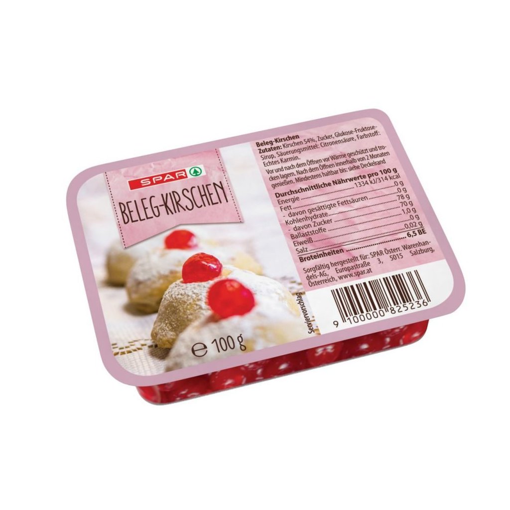 Třešně 54%, cukr, glukózo-fruktózový sirup, okyselovač: kyselina citronová, barva: pravý karmín.