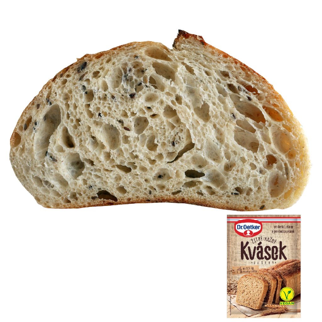 - Na pečení domácího kváskového chleba a pečiva, na 500g mouky. Domácí kváskový chléb: V míse smícháme 150g žitné mouky, 350g pšeničné hladké mouky, 1,5 kávové lžičky soli, 1 kávovou lžičku cukru, 1 balíček droždí Dr.Oetker a 1 balíček Kvásku Dr.Oetker. Postupně přidáváme 400ml vlažné vody, vypracujeme hladké těsto a důkladně prohnětemě. Těsto přikryjeme utěrkou a necháme na teplém místě vykynout asi 1 hodinu. Po vykynutí těsto ještě jednou propracujeme a přeneseme do formy (10 x 30 cm) vyložené papírem na pečení. Povrch potřeme vodou, můžeme posypat semínky, nebo kmínem a podélně nařízneme nožem. chléb necháme ještě 1 hodinu ve formě kynout. Vložíme do předehřáté trouby a pečeme 15 minut při 220°C. Poté ztlumíme teplotu na 190°C a pečeme dalších 30 minut. Chléb vyjmeme z trouby a necháme zcela vychladnout. Návod na oživení sušeného kvásku a zajímavé kváskové recepty najmete na www.oetker.cz.