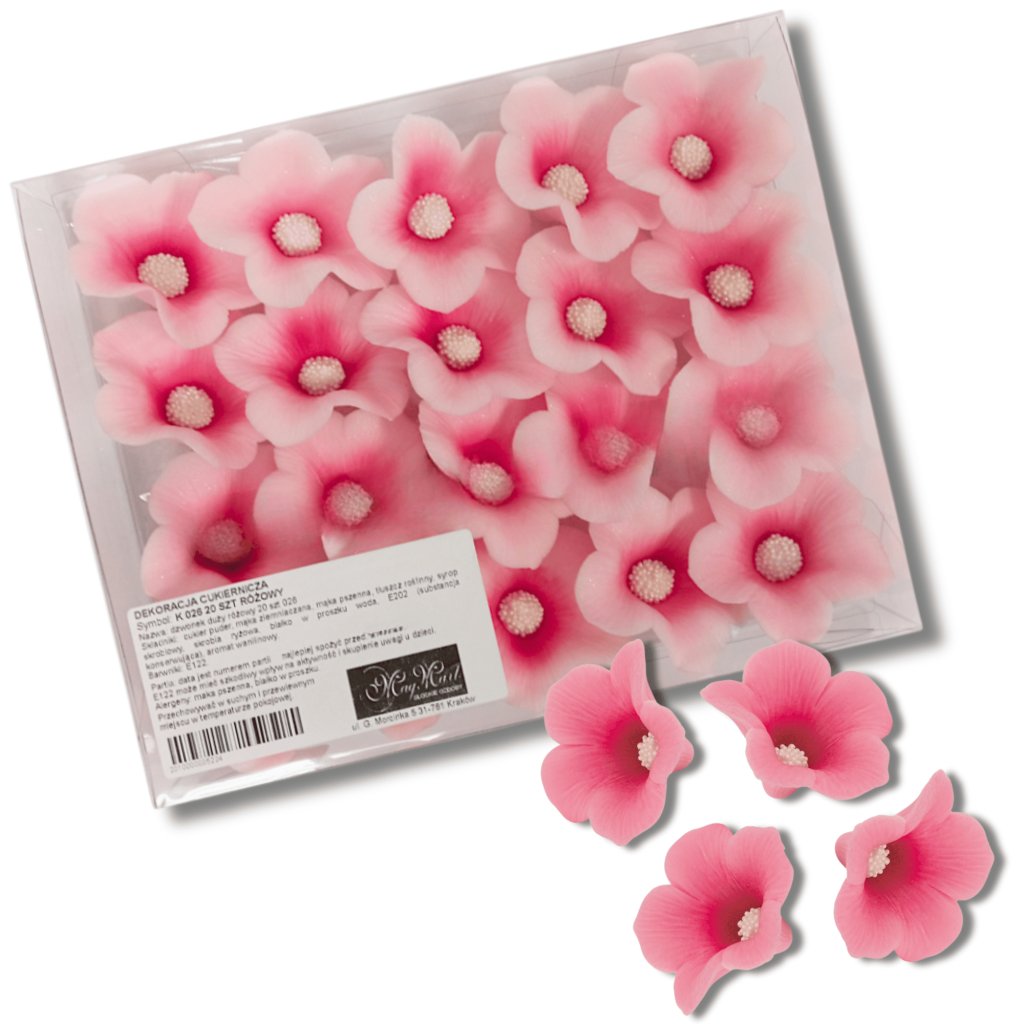 Cukrová dekorace v podobě sady květin. Skvěle se hodí ke zdobení narozeninových a svatebních dortů.