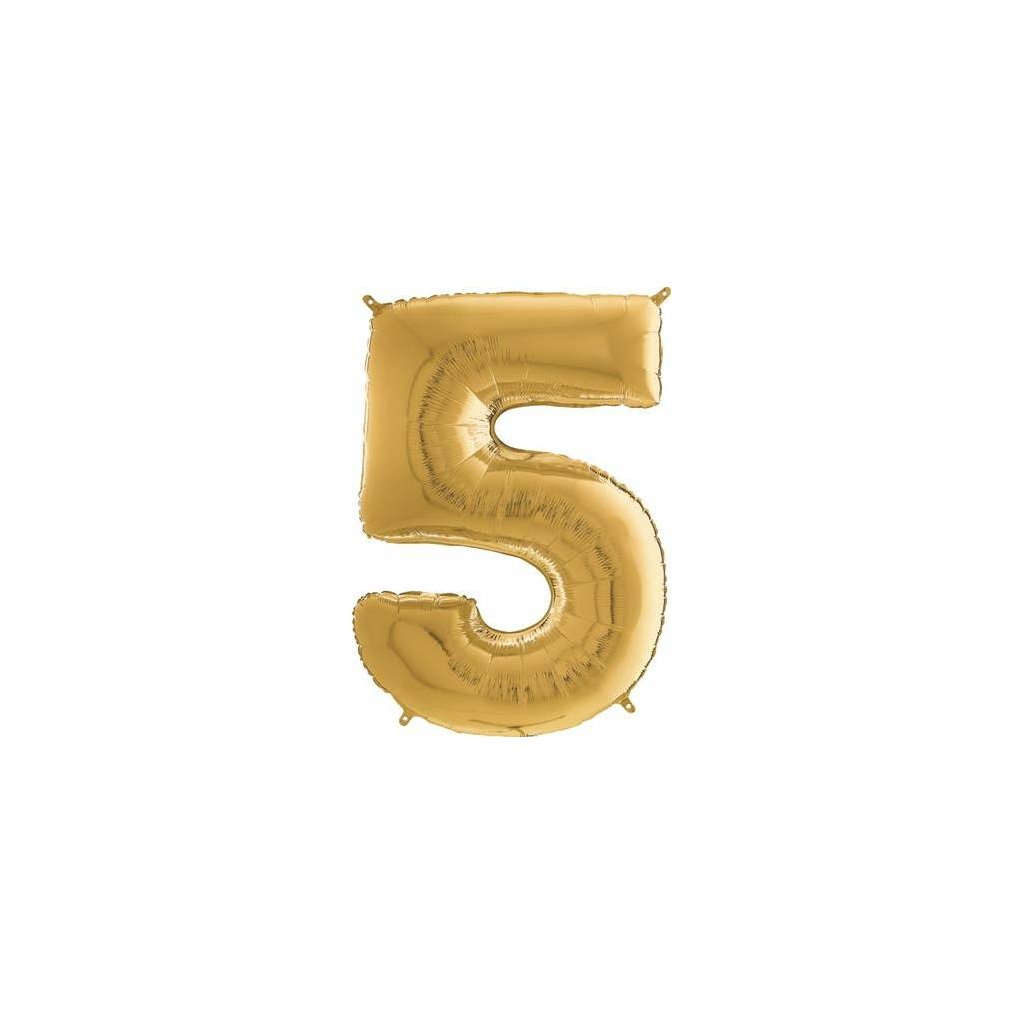 Zlatý balónek číslo 5. Balónek je vyrobený z pevné fólie.Doplňkové parametry