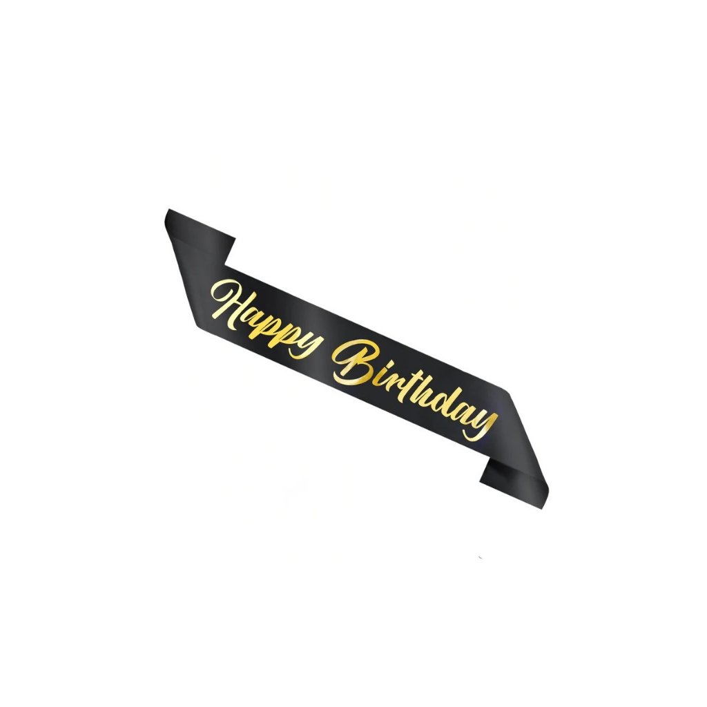 Černá narozeninová šerpa se zlatým nápisem Happy Birthday. Narozeninová šerpa je skvělý nápad, jak odlišit hvězdu narozeninové oslavy. Klasická elegance, kombinace černé s jemně třpytivým zlatým nápisem Happy Birthday, jistě osloví každého oslavence. Rozměry: 10 x 160 cmMateriál: SaténBalení: 1 ksObchodní balení: AnoDoplňkové parametry