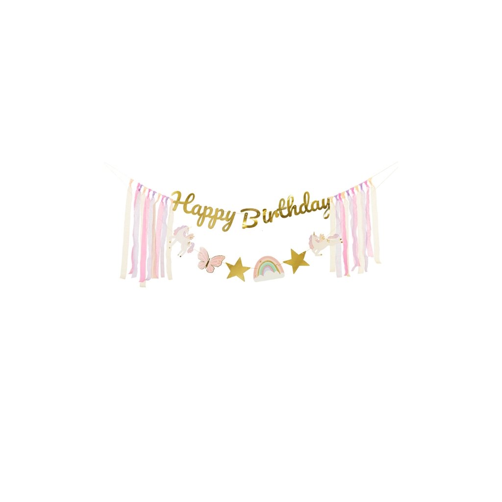 Barevný a krásný narozeninový nápis Happy Birthday ve stylu motýlků a jednorožců, který je dozdobený pentlemi a postavami neodmyslitelně patřícími k fantazii plné jednorožců a motýlků. S touto dekorační sadou vyzdobíte narozeniny jedna dvě a sklidíte zasloužený potlesk. Materiál: PapírVelikost: 230 x 17,5 cmBalení: 1 sadaObchodní balení: AnoDoplňkové parametry