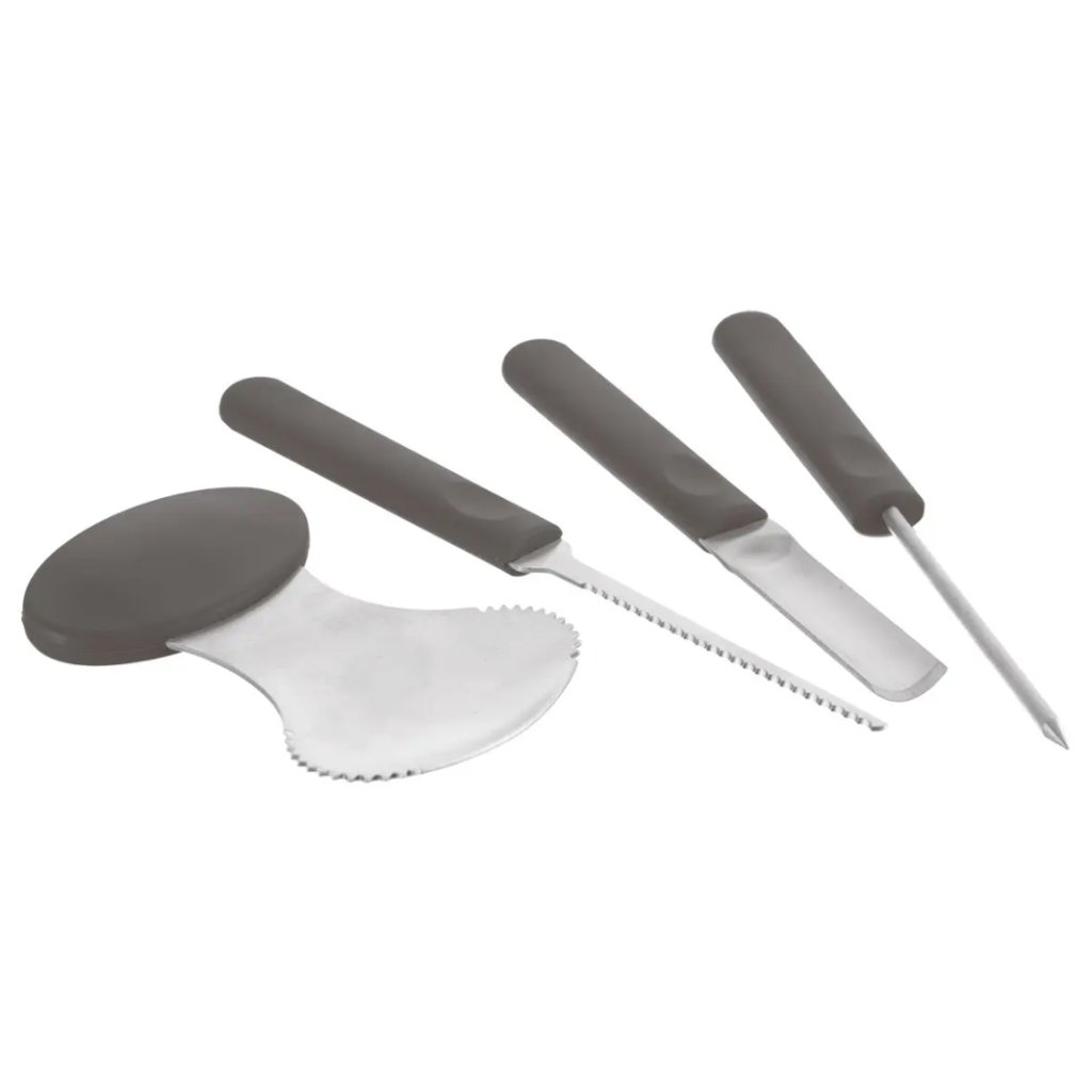 Sada 4 kusů vykrajovačů slouží k vyřezávání dýní, melounů a jiného ovoce a zeleniny. Obsahuje širokou dlabací špachtli, dlátko, pilku a kulatou tenkou špičku.