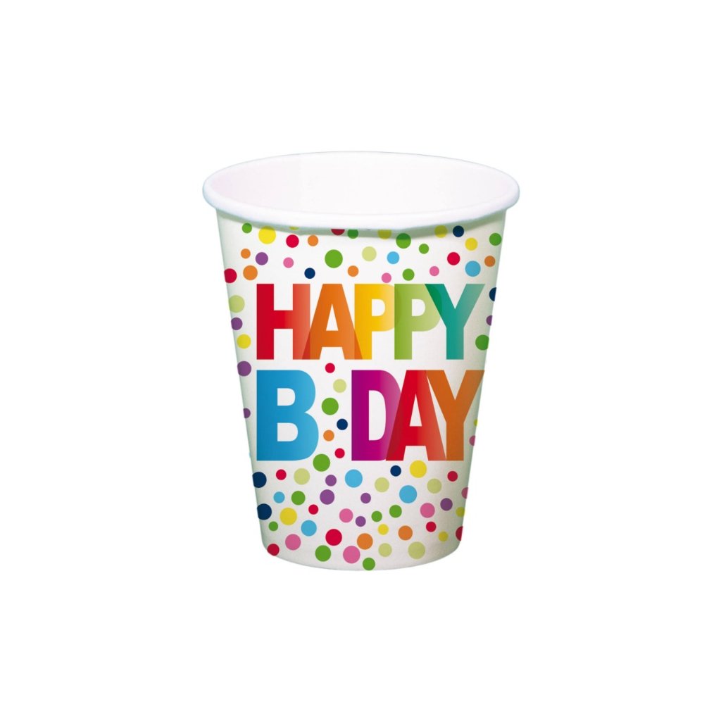Pestrobarevné papírové kelímky s nápisem Happy B Day. Kelímky můžete využít na narozeninových oslavách jak venku tak doma. Kelímky jsou balené v sadě po 8 kusech a objemu 250 ml.Všechny dekorace můžete sladit na naší kolekce Happy Birthday - Barevné puntíky. Objem: 250 mlBalení: 8 ksMateriál: papír, plast (vložka kelímku proti protečení tekutiny)Doplňkové parametry