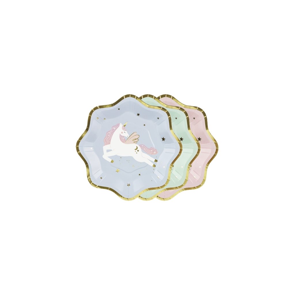 Jemné a krásné papírové talířky s motivem jednorožců, které využijete při narozeninové oslavě, nebo při čajovém dýchánku. Jemné obrázky na talíři krásně doladí zlatý okraj talířků, stejně tak i jemné vykrojení. Talířky jsou dodávány v barevném mixu viz obrázky. Rozměry: 18 x 18 cmMateriál: PapírBalení: 6 ksDoplňkové parametry