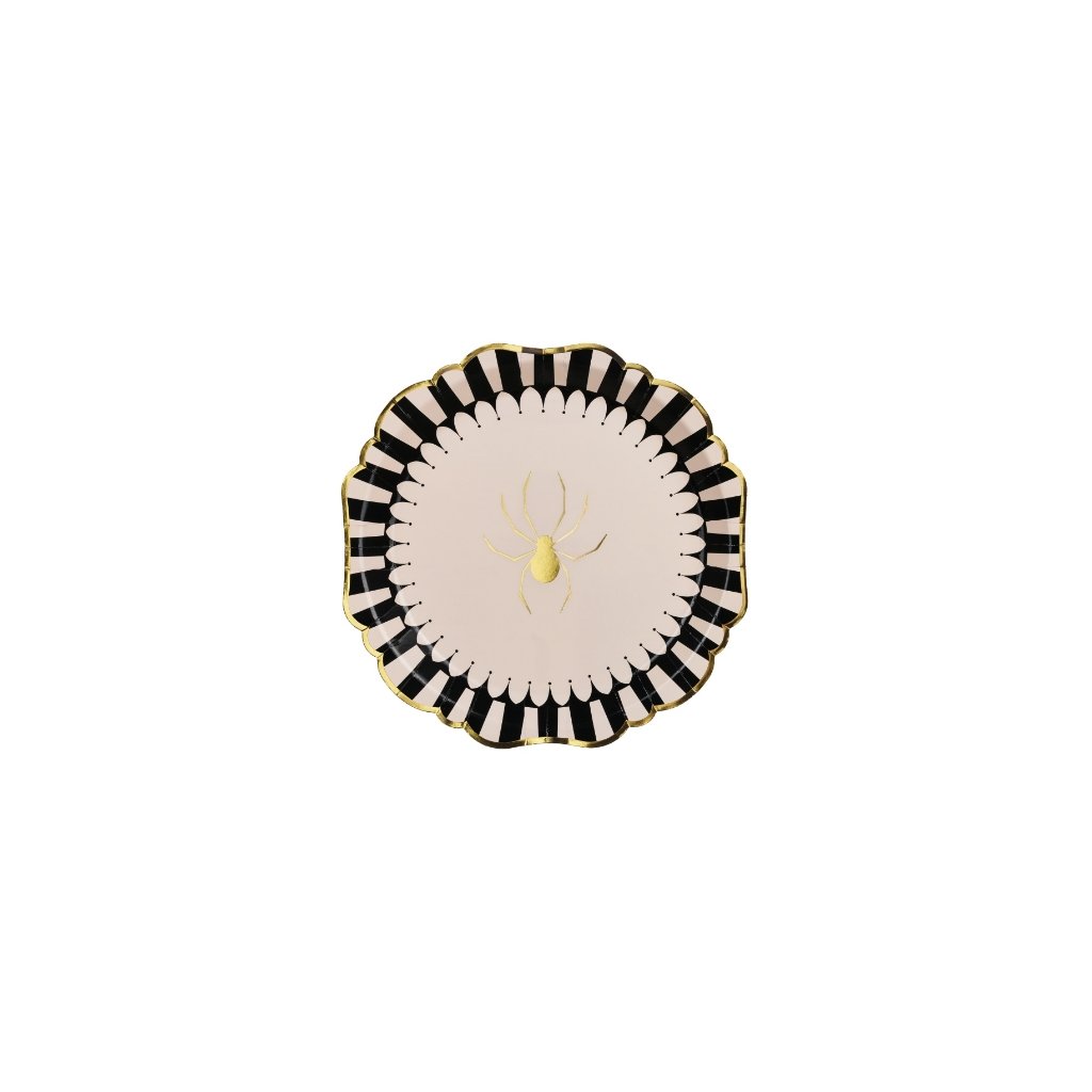Dolaďte svou halloweenskou výzdobu do posledního detailu s těmito papírovými talířky s motivem zlatého pavouka. Elegantní černobílý proužkovaný lem se zlatým okrajem krásně doplňuje ostatní produkty z pavoučí kolekce – kelímky i ubrousky. Talířky mají praktický průměr 23 cm, takže se hodí na dezerty, občerstvení i menší porce. Vyrobeny z pevného papíru, jsou ideální pro stylové stolování během Halloweenu, tematických večírků nebo dívčích oslav. Rozměry: Ø 23 cmMateriál: PapírBarva: Mix – černobílá, zlatý potiskBalení: 6 ksDoplňkové parametry