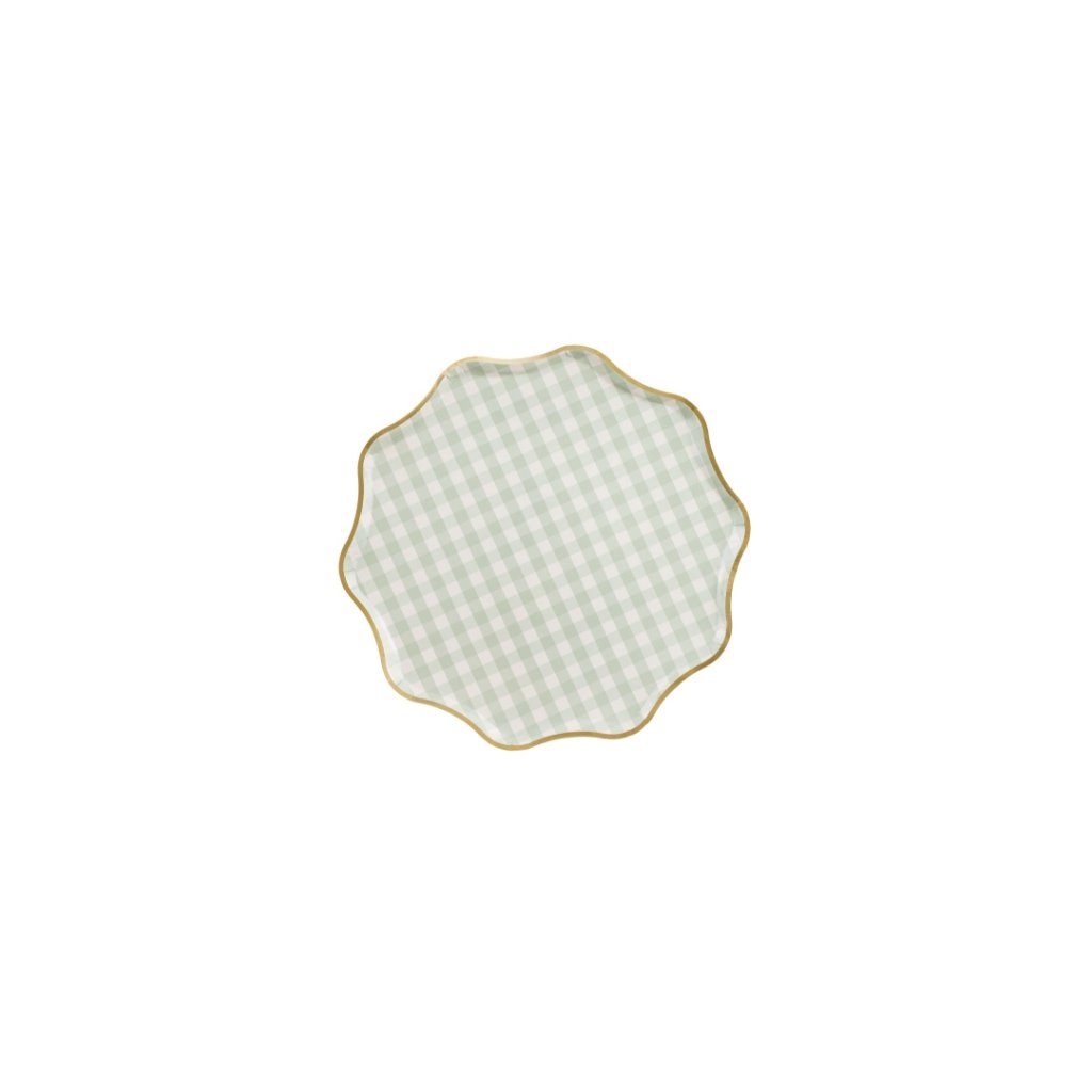 Papírové talířky v něžném designu vynikají kostkovaným vzorem v pastelově zelené barvě a lesklým zlatým lemem, který jim dodává elegantní nádech. Díky pevnému papíru jsou praktické a zároveň krásně ladí s dalšími doplňky z kolekce – ideální volba na baby shower, oslavu narození miminka, piknik, letní párty nebo stylové čajové posezení. Díky svému tvaru s jemně zvlněným okrajem působí jemně a slavnostně. Skvěle ladí s motivem vintage kočárku, květinovým potiskem a pastelovými tóny – doporučujeme kombinovat se stejnou kolekcí kelímků a ubrousků. Průměr: 23 cmMateriál: papírBarva: zelenobílý kostkovaný vzor, zlatý lemBalení: 6 ksDoplňkové parametry