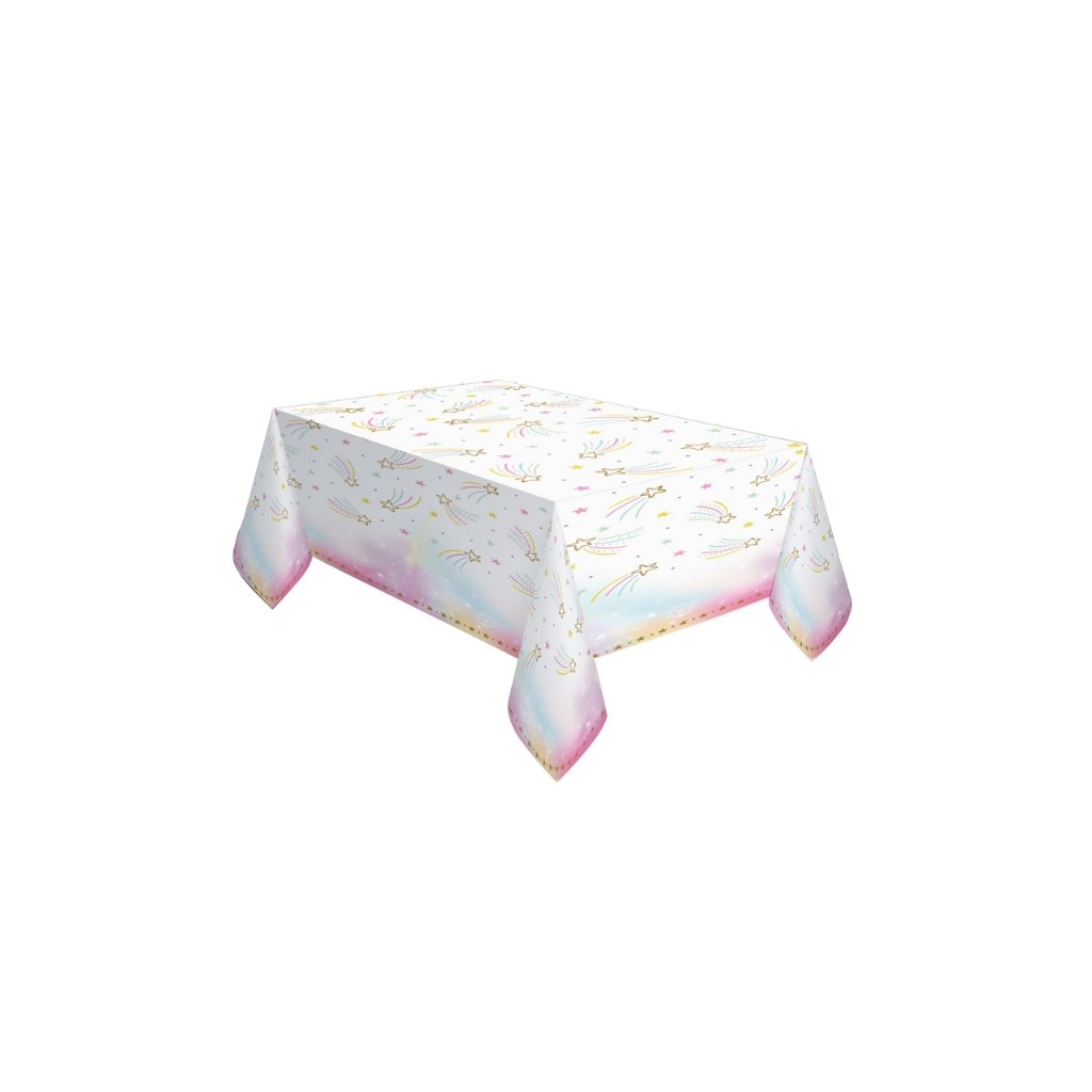 Dopřejte svému party stolu pohádkový vzhled s tímto krásným papírovým ubrusem z kolekce Unicorn Dreams. Bílý podklad zdobí pestré komety, zlaté hvězdičky a okraje přecházející v jemný barevný gradient. Ubrus skvěle padne na dětské oslavy, unicorn narozeninové párty nebo pastelově laděné dívčí slavnosti. Díky papírovému materiálu je zároveň praktický a snadno recyklovatelný. Materiál: PapírBalení: 1 ksRozměry: 180 × 120 cmTvar: ObdélníkovýDoplňkové parametry