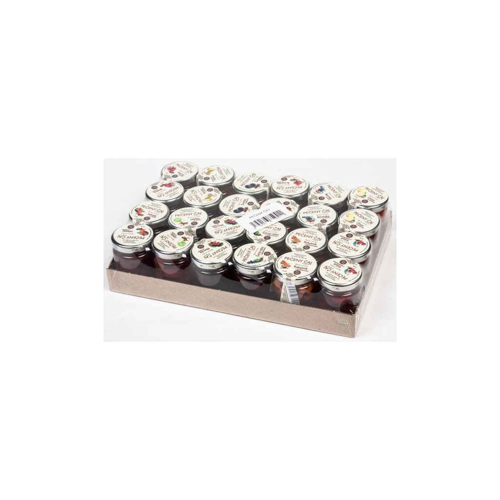 - mix různých druhů čajů viz. etiketa výrobku (např. Višeň se sladidly_Složení: višně 55%, voda, jablečný koncentrát, cukr, zahušťovadla: xanthan, guar, alginát, kyselina jablečná, aroma, barvivo: E120, konzervant: sorban draselný, sladidlo sukralóza; Hruška se skořicí_Složení: hrušky 45%, voda, hruškový koncentrát 15%, cukr, aroma, kyseliny: jablečná, citronová, zahušťovadla: xanthan, guar, alginát, skořice 0,09%, konzervant: sorban draselný, antioxidant: tascorban sodný, sladidlo: sukralóza, Broskev se skořicí_Složení: broskve 48%, voda, jeblečný koncentrát, cukr, aroma, kyseliny: jablečná, citronová, zahušťovadla: guar, xanthan, alginát, konzervant: sorban draselný, skořiče 0,1%, barvivo: betakaroten, antioxidanty: ascorban sodný, disiřičitan sodný.)