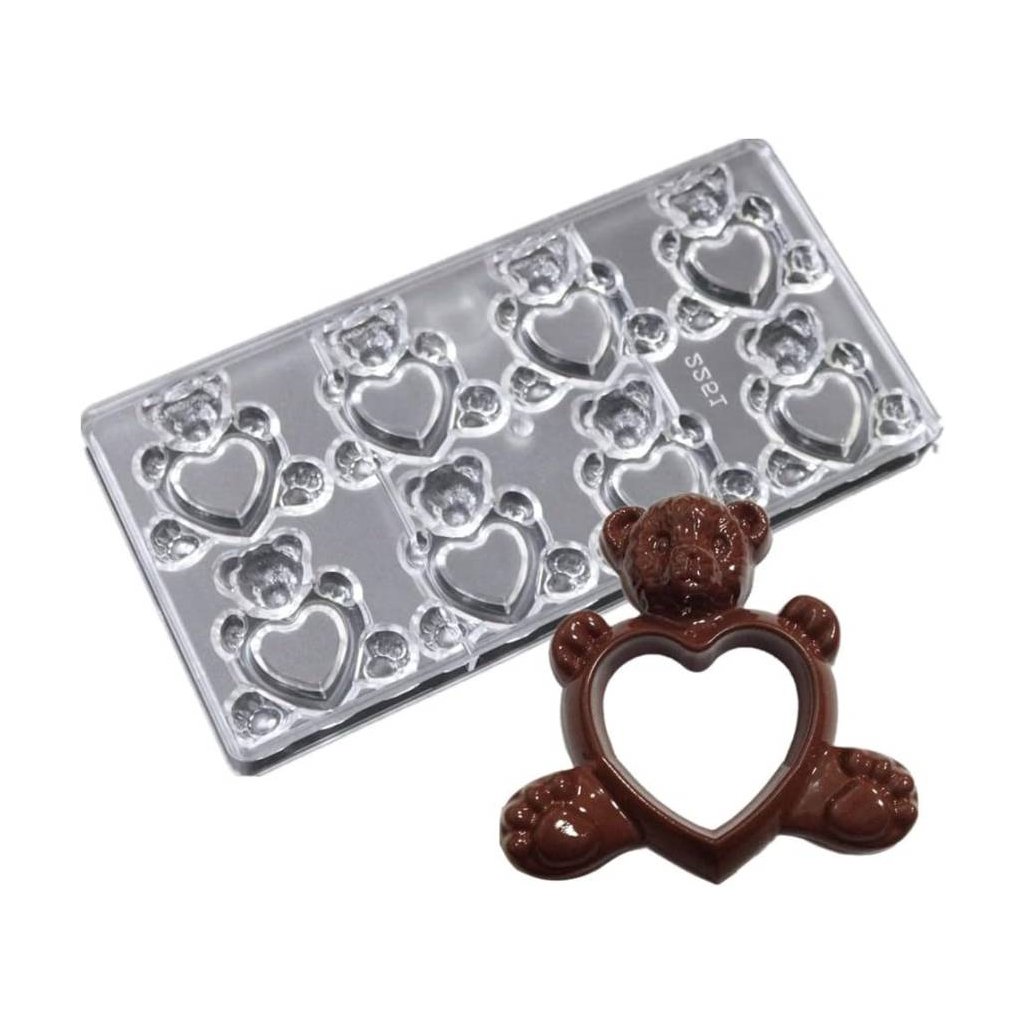 Rozměr formy: 27,5 x 13,5 x 2,5 cm Rozměry medvídků: 6 x 6,2 cm Materiál: plast Výroba čokoládových bonbonů je velice jednoduchá. Při výrobě plných čokolád nalijeme do formy čokoládovou hmotu, povrch srovnáme cukrářskou kartou a necháme ztuhnout. Pokud chceme vyrábět plněné bonbony, musíme nejdříve vyrobit tzv. skořápku, to představuje nanesení čokolády na boky tvarovné formy, dáme do mrazáku podchladit a pokud je vrstva tenčí, naneseme vrstvu druhou. Do vytvořené skořepiny vkládáme požadovanou náplň - marcipán, alkoholové náplně, oříškové nebo karamelové. Záleží jen na naší fantazii a chuti. Při plnění skořepiny nezapomeneme na ponechání prostoru na zavíčkování bonbonu – tj. zalití náplně další vrstvičkou čokolády. Formu opět vkládáme do chladu a po vytuhnutí vyklepneme.Doplňkové parametry