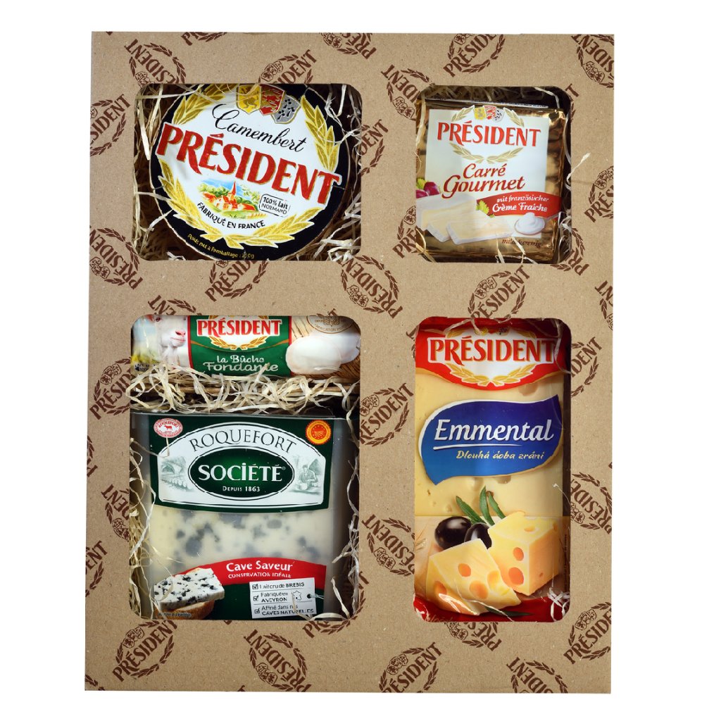 - PRÉSIDENT Camembert Měkký zrající sýr s bílou plísní na povrchu. Složení: MLÉKO, jedlá sůl, sýrařské kultury, mikrobiální syřidlo. // La Buche Fondante Zrající kozí sýr s bílou plísní na povrchu. Složení: pasterované kozí MLÉKO, jedlá sůl, sýrařské kultury, mikrobiální syřidlo. // La Brique Měkký zrající sýr s bílou plísní na povrchu. Složení: pasterované MLÉKO, jedlá sůl, sýrařské kultury, živočišné syřidlo. // Emmental bloček Porcovaný tvrdý sýr. Složení: MLÉKO, jedlá sůl, mléčné kultury, barvivo beta karoten. // SOCIETE Roquefort Zrající sýr s modrou plísní zrající v celé hmotě, plnotučný. Složení: nepasterované ovčí MLÉKO, jedlá sůl, sýrařské kultury, živočišné syřidlo, ušlechtilá plíseň Penicillium roqueforti.
