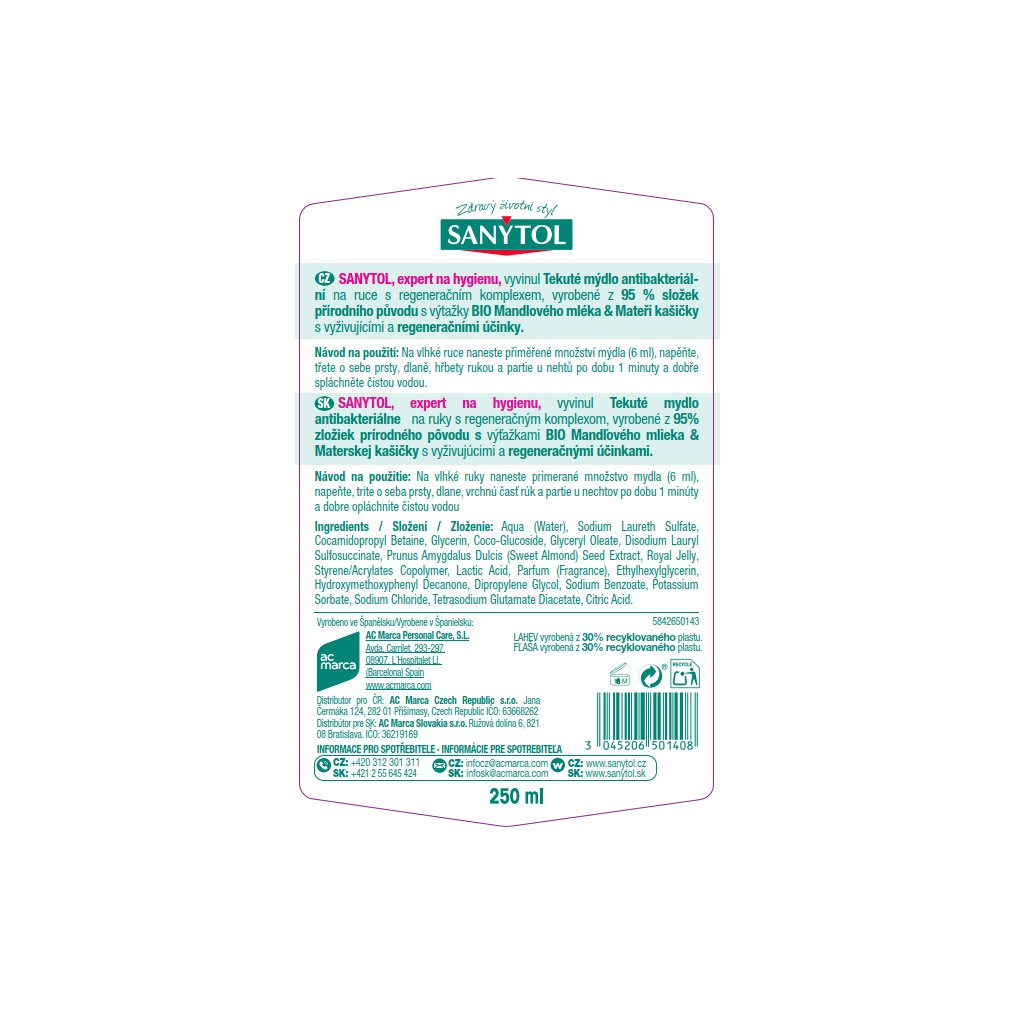 Produkt SANYTOL Mýdlo tekuté antibakteriální výživné 250 ml Vás nezklame.