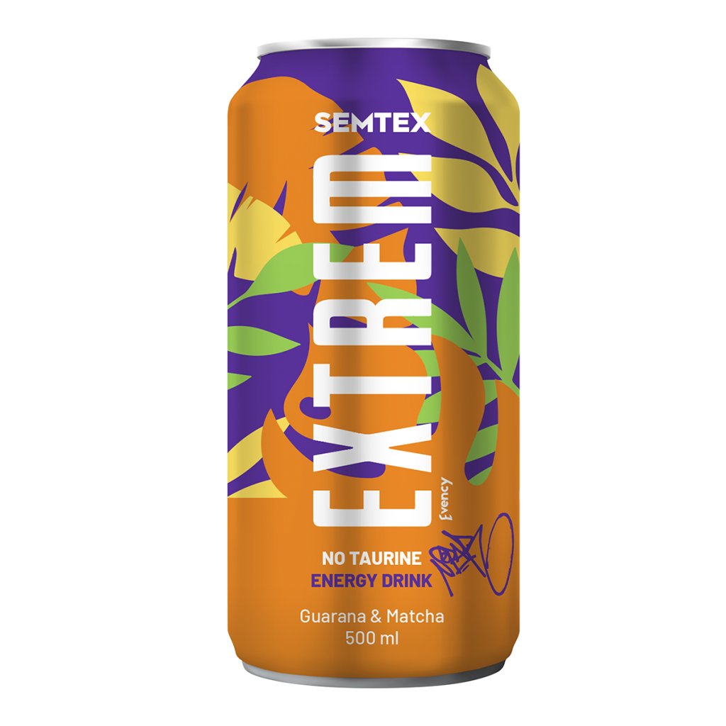 - Semtex Extrem 0,5l, sycený nealkoholický energetický nápoj s obsahem kofeinu, extraktem guarany a matcha tea, s vitamíny.