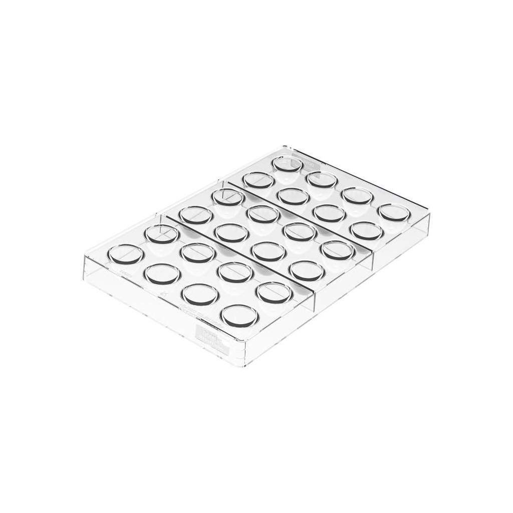 Rozměr formy: 27,5 x 17,5 x 2,5 cm Rozměr pralinky: 2,6 x 2,2 cm Objem pralinky: 8 ml Materiál: polykrabonát Výroba čokoládových bonbonů je velice jednoduchá. Při výrobě plných čokolád nalijeme do formy čokoládovou hmotu, povrch srovnáme cukrářskou kartou a necháme ztuhnout. Pokud chceme vyrábět plněné bonbony, musíme nejdříve vyrobit tzv. skořápku, to představuje nanesení čokolády na boky tvarovné formy, dáme do mrazáku podchladit a pokud je vrstva tenčí, naneseme vrstvu druhou. Do vytvořené skořepiny vkládáme požadovanou náplň - marcipán, alkoholové náplně, oříškové nebo karamelové. Záleží jen na naší fantazii a chuti. Při plnění skořepiny nezapomeneme na ponechání prostoru na zavíčkování bonbonu – tj. zalití náplně další vrstvičkou čokolády. Formu opět vkládáme do chladu a po vytuhnutí vyklepneme.Doplňkové parametry