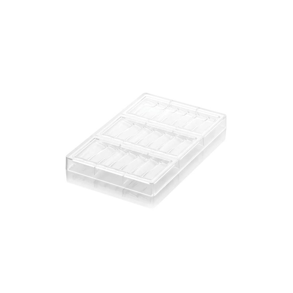 Rozměr formy: 27,5 x 17,5 x 2,5 cm Rozměr tabulky: 15,05 x 7 x 1,1 cm Objem tabulky: 85 ml Materiál: polykrabonát Výroba čokoládových bonbonů je velice jednoduchá. Při výrobě plných čokolád nalijeme do formy čokoládovou hmotu, povrch srovnáme cukrářskou kartou a necháme ztuhnout. Pokud chceme vyrábět plněné bonbony, musíme nejdříve vyrobit tzv. skořápku, to představuje nanesení čokolády na boky tvarovné formy, dáme do mrazáku podchladit a pokud je vrstva tenčí, naneseme vrstvu druhou. Do vytvořené skořepiny vkládáme požadovanou náplň - marcipán, alkoholové náplně, oříškové nebo karamelové. Záleží jen na naší fantazii a chuti. Při plnění skořepiny nezapomeneme na ponechání prostoru na zavíčkování bonbonu – tj. zalití náplně další vrstvičkou čokolády. Formu opět vkládáme do chladu a po vytuhnutí vyklepneme.Doplňkové parametry