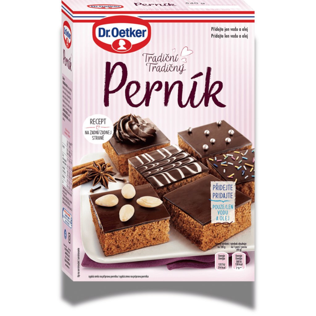 - Balení obsahuje: 540 g směsi na přípravu těsta K tomu přidáte: 400 ml vody 120 ml oleje (12 polévkových lžic) Všechny druhy trub před pečením dobře předehřejte! Elektrická trouba: 165 °C 40 - 50 min. Horkovzdušná trouba: 155 °C 40 - 50 min. Plynová trouba: střední stupeň 40 - 50 min. Při pečení respektujte zkušenosti s vlastní troubou! Příprava: 1. Obsah sáčku se směsí na přípravu těsta vysypeme do mísy a přidáme odměřenou vodu a olej. Na zlepšení chuti můžeme přidat 2 - 3 polévkové lžíce medu. Vše důkladně promícháme vařečkou nebo vyšleháme elektrickým ručním šlehačem dohladka. 2. Těsto vylijeme na vymazaný a moukou vysypaný plech (30 x 40 cm) a dáme péct. Čas a teplota pečení jsou uvedené v tabulce. Pokud chceme mít jistotu, že je perník správně upečený, píchneme doprostřed těsta špejlí. Pokud se na ni těsto nelepí, perník je hotový. 3. Po vychladnutí můžeme upečený perník potřít džemem, polít tmavou polevou Dr. Oetker a ozdobit podle vlastní fantazie ořechy, kokosem nebo zdobením Dr. Oetker. Tip: Perníkové řezy s jablky Perníkové těsto připravíme podle návodu. Do těsta přidáme 2 polévkové lžíce rumu a 300 g oloupaných a nahrubo nastrouhaných jablek. Důkladně promícháme. Pečeme v předehřáté troubě při teplotě podle tabulky asi 40 minut. Po upečení necháme perník vychladnout, polijeme tmavou polevou Dr. Oetker a nakrájíme na řezy.