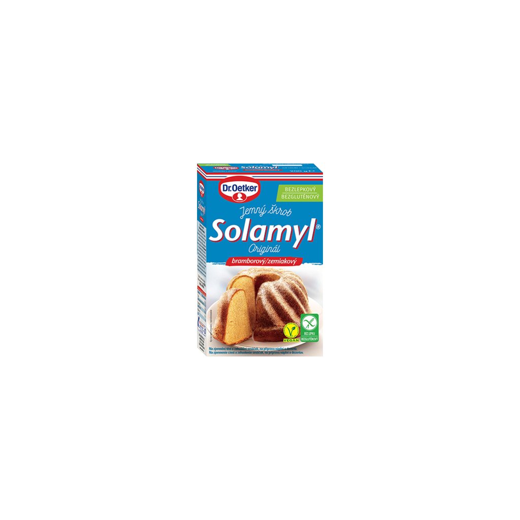 - Piškotovému těstu dodává jemnou strukturu. Lze použít na přípravu různých náplní a omáček za tepla. Ideální na přípravu asijské kuchyně.Recept z obalu: Bábovka:250g másla, 250g cukru, 1 balíček Vanilínového cukru Dr.Oetker a 4 vejce vyšleháme elektrickým ručním šlehačem do pěny. 300g hladké mouky promícháme se 100g Solamylu a 1/2 balíčkem Kypřícího prášku do pečiva Dr.Oetker a lehce vmícháme do těsta společně s 200ml mléka. Těsto vlijeme do vymazané a moukou vysypané bábovkové formy a pečeme v předehřáté troubě při 175°C (elektrická trouba) po dobu asi 50 minut. Necháme vychladnout a servírujeme.