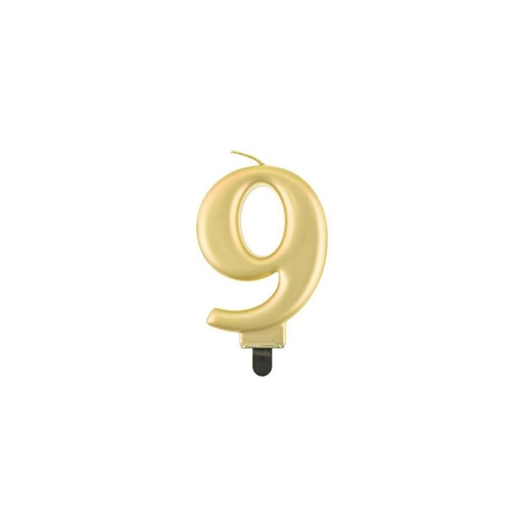 Narozeninová svíčka na dort. Svíčka ve tvaru čísla 9. Barva: metalická zlatá. Balení: 1 ks. Velikost: 8 cmDoplňkové parametry