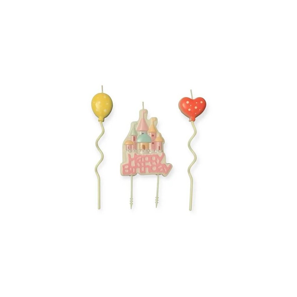 Dodejte narozeninovému dortu pohádkové kouzlo! Tato sada obsahuje svíčku s nápisem Happy Birthday doplněnou o zámek a dvě svíčky ve tvaru balónků. Vytváří krásnou, veselou dekoraci, která rozzáří každý dort. Výška zámku: 8 cm Výška balónků: 11 cmDoplňkové parametry