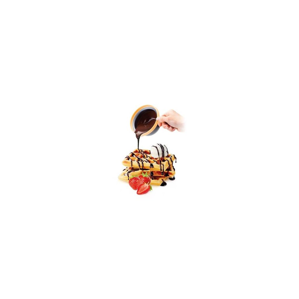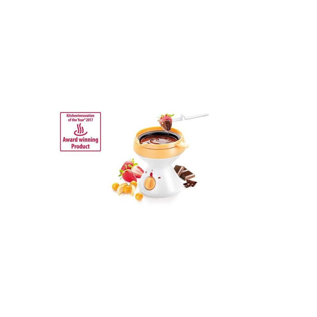 Čerstvé ovoce máčené v rozpuštěné horké čokoládě, to je zaručený recept na skvělé pohoštění při každé rodinné oslavě a dětské party. V čem je čokoládové fondue DELÍCIA výjimečné? V elektrickém čokoládovém fondue DELÍCIA připravíte snadno a rychle lahodné fondue z bílé, hořké nebo mléčné čokolády. Pak stačí naporcovat jahody, banán, hroznové víno nebo mandarinku a připravené ovoce můžete v horké čokoládě namáčet a pochutnávat si. Oproti původnímu keramickému fondue, ve kterém se čokoláda v misce rozpouštěla hořící svíčkou, má elektrické čokoládové fondue DELÍCIA celou řadu výhod. Na rozdíl od keramického například v elektrickém fondue nehrozí, že by rozpuštěná čokoláda v misce vyschla, nebo se dokonce připálila. Přístroj má 2 stupně zahřívání: stupeň s vyšší teplotou 60 °C slouží pro rychlé rozpouštění čokolády. stupeň s nižší teplotou 40 °C slouží pro uchování čokolády v rozpuštěném stavu během podávání. Používání elektrického čokoládového fondue je naprosto bezpečné, riziko opaření při přípravě ani podávání fondue nehrozí. Pořádání fondue party se mohou bez obav plně zúčastnit i děti. Miska s antiadhezním povlakem na rozpouštění čokoládového fondue je opatřena přenášecí rukojetí s nálevkou. Rozpuštěnou čokoládou můžete díky tomu kdykoliv bezpečně přenést a pohodlně dekorovat moučníky nebo plnit silikonové formičky při výrobě čokoládových pamlsků. Jaké má čokoládové fondue DELÍCIA další výhody? 6 fondue vidliček můžete během podávání odložit na okraj misky s ochranným víčkem pro uchování nespotřebované čokolády v lednici vidličky se neztratí, skladují se v misce uzavřené víčkem vložené v přístroji Materiál: vyrobeno z kvalitního odolného plastu, kovová miska s prvotřídním antiadhezním povlakem. Údržba: víčko, rozpouštěcí miska, rukojeť a fondue vidličky vhodné do myčky.Doplňkové parametry