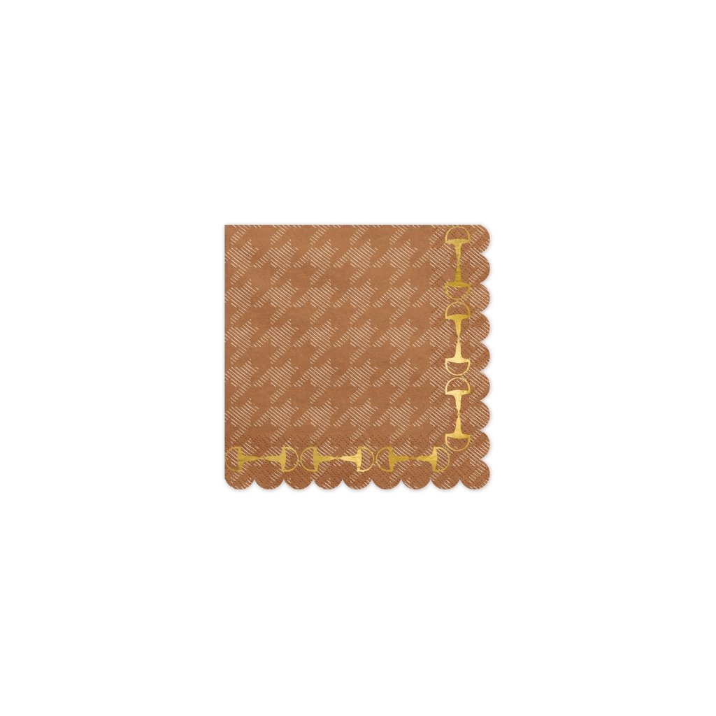 Hnědé ubrousky s jemným vzorem kohoutí stopy a okrajem zdobeným zlatými třmeny dokonale ladí k oslavám s koňskou nebo westernovou tematikou. Hodí se na narozeniny malých i velkých milovníků koní, ale i na pikniky nebo stylové garden party. Díky elegantnímu designu a kvalitnímu zpracování působí velmi reprezentativně. Skvěle vyniknou spolu s talířky s motivem koně nebo se zlatými doplňky, které podtrhnou zlaté detaily na ubrouscích. Rozměry: 33 x 33 cm (v rozloženém stavu)Materiál: PapírBarva: Hnědá se zlatým potiskemBalení: 12 kusůVhodné ke kombinaci: s talířky s motivem koně, zlatým příborem a přírodní dekoracíDoplňkové parametry