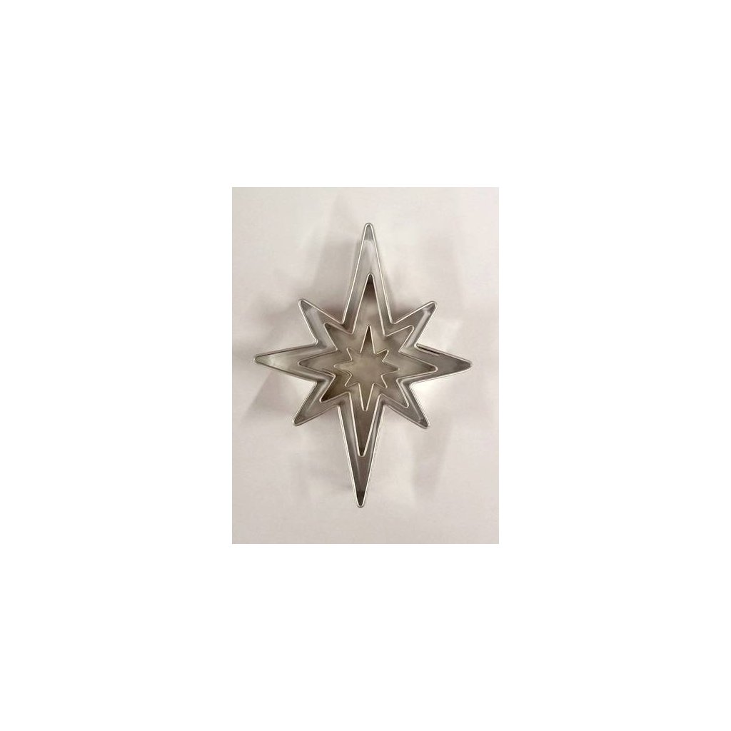 Osmícípé hvězdy s dlouhými ostrými paprsky, sada obsahuje tři kusy a poslouží jako samostatné cukroví, zákusky či je použijeme v kombinaci s dalšími sladkostmi. Ať už vykrajujete perník, těsto či fondán, tyto hvězdičky budou vždy velice efe.Doplňkové parametry