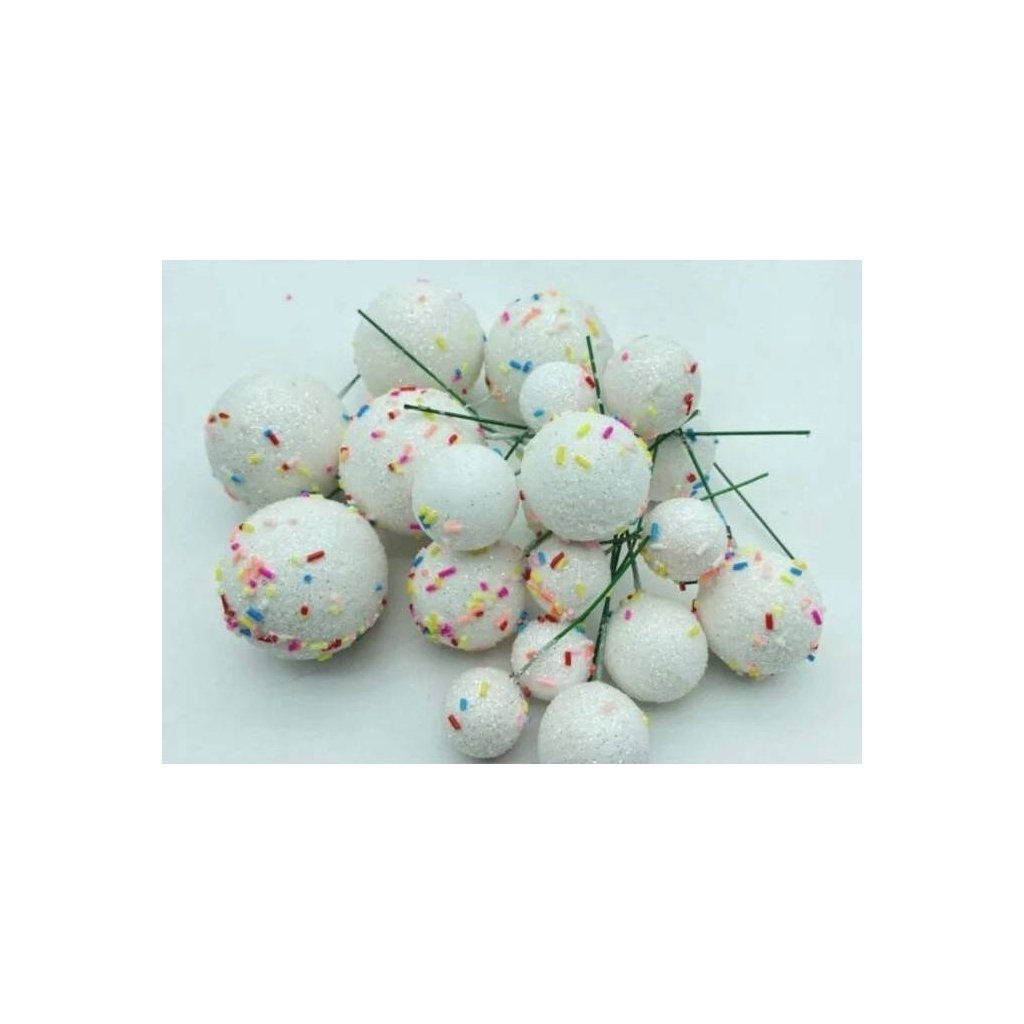 Zápich do dortu Koule bílé glitterové s ozdobami různé velikosti (20 ks) ▹